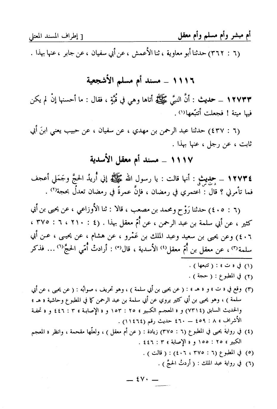 12734 -[د ت س ق] حديث أنها قالت يا رسول الله صَلَّى اللَّهُ عَلَيْهِ وَسَلَّمَ إني أريد الحج وجملي أعجف فما تأمرني قال اعتمري في رمضان فإن عمرة في رمضان تعدل بحجة (6: 405) حدثنا روح ومحمد بن مصعب قالا ثنا الأوزاعي عن يحيى بن أبي كثير عن أبي سلمة بن عبد الرحمن عن أم معقل بهذا (4: 210، 6: 375، 406) وعن يحيى بن سعيد وعبد الملك بن عمرو عن هشام عن يحيى عن أبي سلمة عن معقل بن أم معقل الأسدية قال أرادت أمي الحج ... . فذكر -[471]- نحوه (6: 405 - 406) وعن محمد بن جعفر وحجاج عن شعبة عن إبراهيم بن مهاجر عن أبي بكر بن عبد الرحمن بن الحارث، قال أرسل مروان إلى أم معقل يسألها عن هذا الحديث، فحدثته أن زوجها جعل بكرا [لها] في سبيل الله وأنها أرادت العمرة فسألت زوجها البكر فأبى فأتت النبي صَلَّى اللَّهُ عَلَيْهِ وَسَلَّمَ فذكرت ذلك له ... . الحديث (6: 406) وعن ابن نمير عن محمد بن أبي إسماعيل عن إبراهيم بن مهاجر عن أبي بكر عن معقل بن أبي معقل أن أمه أتت رسول الله صَلَّى اللَّهُ عَلَيْهِ وَسَلَّمَ ... فذكر معناه (6: 375) وعن عفان عن أبي عوانة كلاهما عن إبراهيم بن مهاجر عن أبي بكر قال أخبرني رسول مروان الذي أرسل به إلى أم معقل قالت خرج أبو معقل حاجا مع النبي صَلَّى اللَّهُ عَلَيْهِ وَسَلَّمَ..... فذكر معناه (6: 406) وعن عبد الرزاق عن معمر عن الزهري عن أبي بكر عن امرأة من بني أسد يقال لها أم معقل ... نحوه (6: 406) وعن يعقوب عن أبيه عن ابن إسحاق عن يحيى بن عباد عن الحارث بن أبي بكر بن عبد الرحمن عن أبيه قال كنت فيمن ركب مع مروان إلى أم معقل قال وكنت فيمن دخل عليها من الناس معه وسمعتها حين حدثت هذا الحديث (6: 406) وعن يحيى بن آدم عن إسرائيل عن أبي إسحاق عن الأسود -[472]- عن أبي معقل عن أم معقل أنها سألت رسول الله صَلَّى اللَّهُ عَلَيْهِ وَسَلَّمَ فقال عمرة في رمضان تعدل حجة