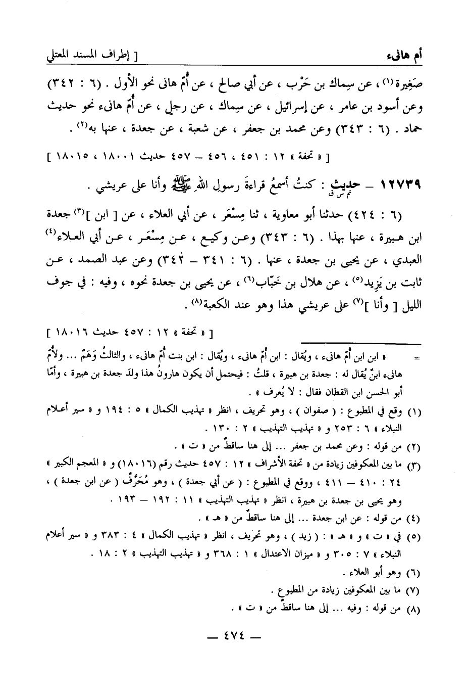 12739 -[تم س ق] حديث: كنت أسمع قراءة رسول الله صَلَّى اللَّهُ عَلَيْهِ وَسَلَّمَ وأنا على عريشي (6: 424) حدثنا أبو معاوية ثنا مسعر عن أبي العلاء عن ابن جعدة بن هبيرة عنها بهذا (6: 343) وعن وكيع عن مسعر عن أبي العلاء العبدي عن يحيى بن جعدة عنها (6: 341 - 342) وعن عبد الصمد عن ثابت بن يزيد عن هلال بن خباب عن يحيى بن جعدة نحوه وفيه في جوف الليل وأنا على عريشي هذا وهو عند الكعبة.
