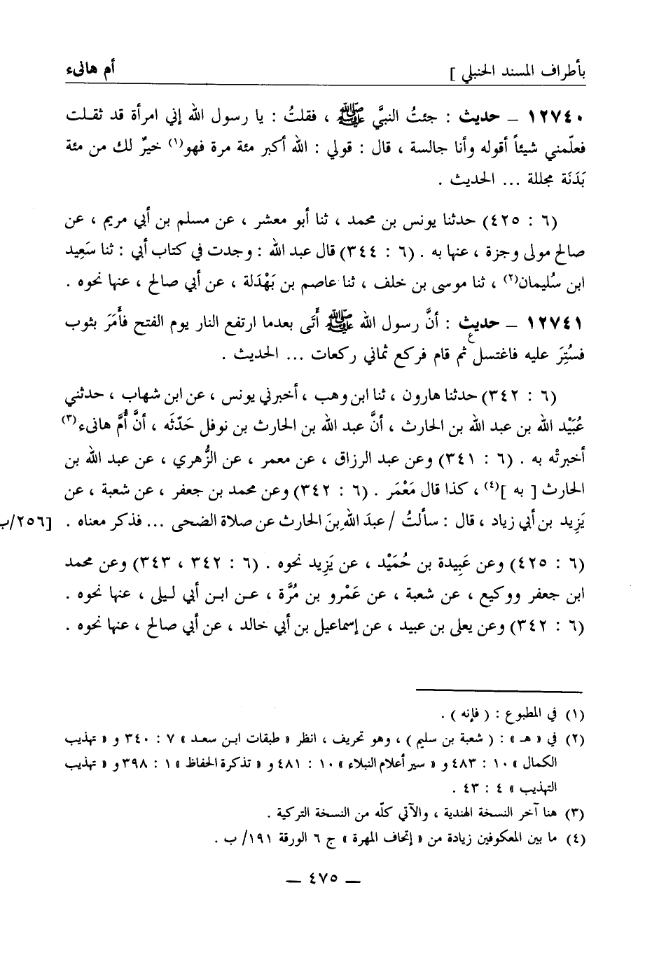 12741 -[ع] حديث: أن رسول الله صَلَّى اللَّهُ عَلَيْهِ وَسَلَّمَ أتى بعدما ارتفع النار يوم الفتح فأمر بثوب فستر عليه فاغتسل ثم قام فركع ثماني ركعات ... . الحديث (6: 342) حدثنا هارون ثنا ابن وهب أخبرني يونس عن ابن شهاب حدثني عبيد الله بن عبد الله بن الحارث، أن عبد الله بن الحارث بن نوفل حدثه أن أم هانئ أخبرته به (6: 341) وعن عبد الرزاق عن معمر عن الزهري عن عبد الله بن الحارث به كذا قال معمر (6: 342) وعن محمد بن جعفر عن شعبة عن يزيد بن أبي زياد قال سألت عبد الله بن الحارث عن صلاة الضحى ... فذكر معناه (6: 425) وعن عبيدة بن حميد عن يزيد نحوه (6: 342، 343) وعن محمد بن جعفر ووكيع عن شعبة عن عمرو بن مرة عن ابن أبي ليلى عنها نحوه (6: 342) وعن يعلى بن عبيد عن إسماعيل بن أبي خالد عن أبي صالح عنها نحوه -[476]- (6: 423 - 424) وعن سفيان عن ابن عجلان عن سعيد (6: 343) وعن عبد الله بن الحارث المخزومي عن الضحاك بن عثمان عن إبراهيم بن عبد الله بن حنين (6: 343، 423، 425) وعن عبد الرحمن بن مهدي وإسحاق، عن مالك عن أبي النضر كلهم عن أبي مرة مولى عقيل بن أبي طالب عنها بمعناه وزاد - إلا من رواية الضحاك - في أوله أتيت رسول الله صَلَّى اللَّهُ عَلَيْهِ وَسَلَّمَ عام الفتح فقلت: يا رسول الله قد أجرت حموين لي فزعم أخي أنه قاتله ... . الحديث وزادوا أيضا ثم التحف بثوبه مخالفا بين طرفيه