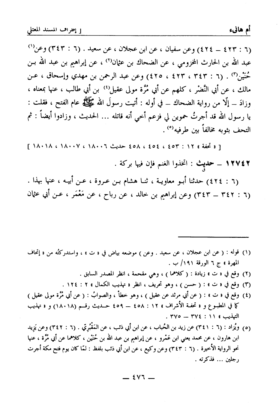 12742 -[ق] حديث اتخذوا الغنم فإن فيها بركة (6: 424) حدثنا أبو معاوية ثنا هشام بن عروة عن أبيه عنها بهذا (6: 342 - 343) وعن إبراهيم بن خالد عن رباح عن معمر عن أبي عثمان -[477]- الجحشي عن موسى أو فلان بن عبد الرحمن بن أبي ربيعة عنها نحوه