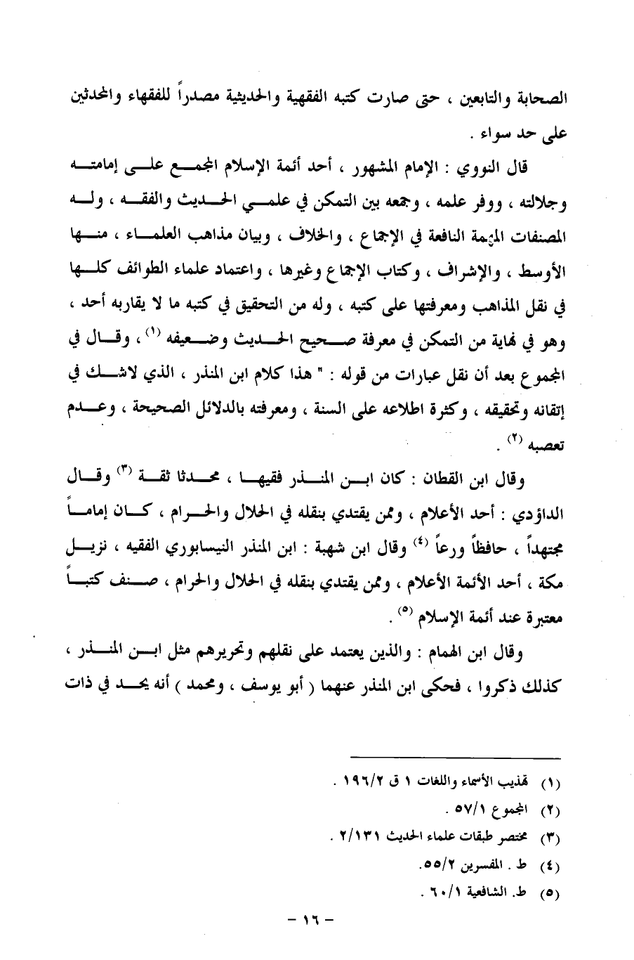 قال النووي: الإمام المشهور، أحد أئمة الإسلام المجمع على إمامته وجلالته، ووفر علمه، وجمعه بين التمكن في علمى الحديث والفقه، وله المصنفات المهمة النافعة في الإجماع، والخلاف، وبيان مذاهب العلماء، منها الأوسط، والإشراف، وكتاب الإجماع وغيرها، واعتماد علماء الطوائف كلها في نقل المذاهب ومعرفتها على كتبه، وله من التحقيق في كتبه ما لا يقاربه أحد، وهو في نهاية من التمكن في معرفة صحيح الحديث وضعيفه (¬1)، وقال في المجموع بعد أن نقل عبارات من قوله: هذا كلام ابن النذر، الذي لا شك في إتقانه وتحقيقه، وكثرة اطلاعه على السنة، ومعرفته بالدلائل الصحيحة، وعدم تعصبه (¬2).