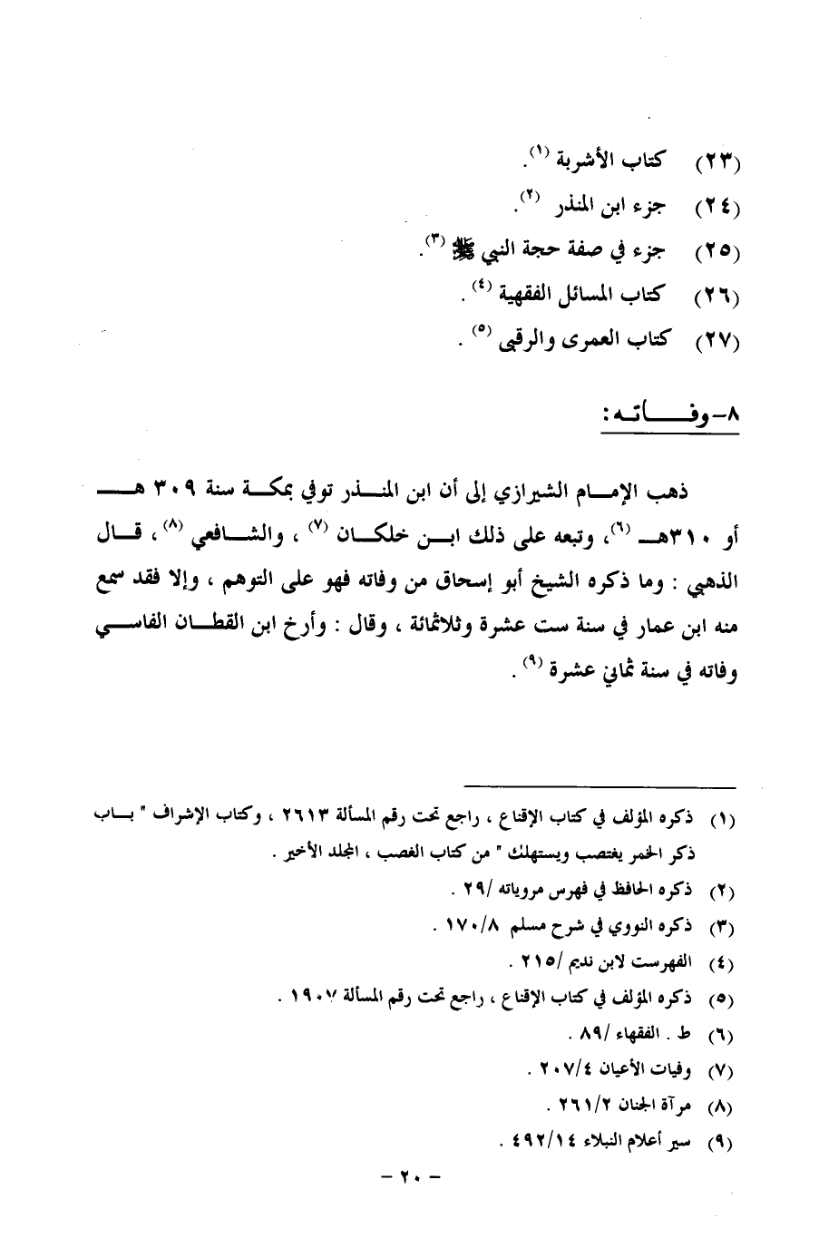 ذهب الإمام الشيرازي إلى أن ابن المنذر توفي بمكة سنة 359 هـ أو 310 هـ (¬6)، وتبعه على ذلك ابن خلكان (¬7)، والشافعي (¬8)، قال الذهبي: وما ذكر الشيخ أبو إسحاق من وفاته فهو على التوهم، وإلا فقد سمع منه ابن عمار في سنة ست عشرة وثلاثمائة، وقال: وأرخ ابن القطان الفاسي وفاته في سنة ثماني عشرة (¬9).
