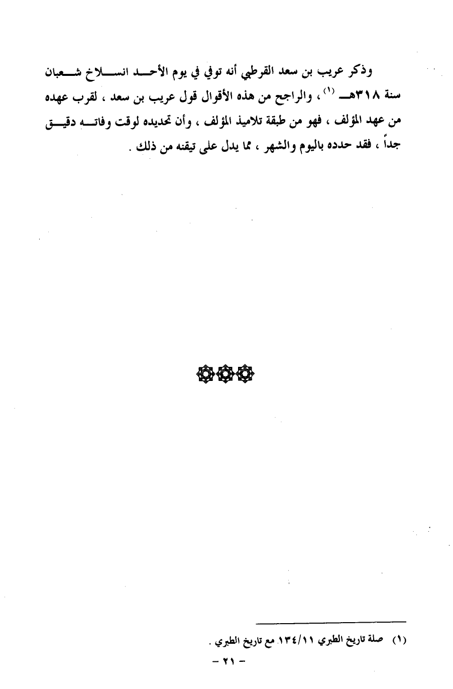 وذكر عريب بن سعد القرطبي أنه توفي في يوم الأحد انسلاخ شعبان سنة 318 هـ (¬1)، والراجح من هذه الأقوال قول عريب بن سعد، لقرب عهده من عهد المؤلف، ومن طبقة تلاميذ المؤلف، وأن تحديده لوقت وفاته دقيق جداً، فقد حدده باليوم والشهر، مما يدل على تيقنه من ذلك.