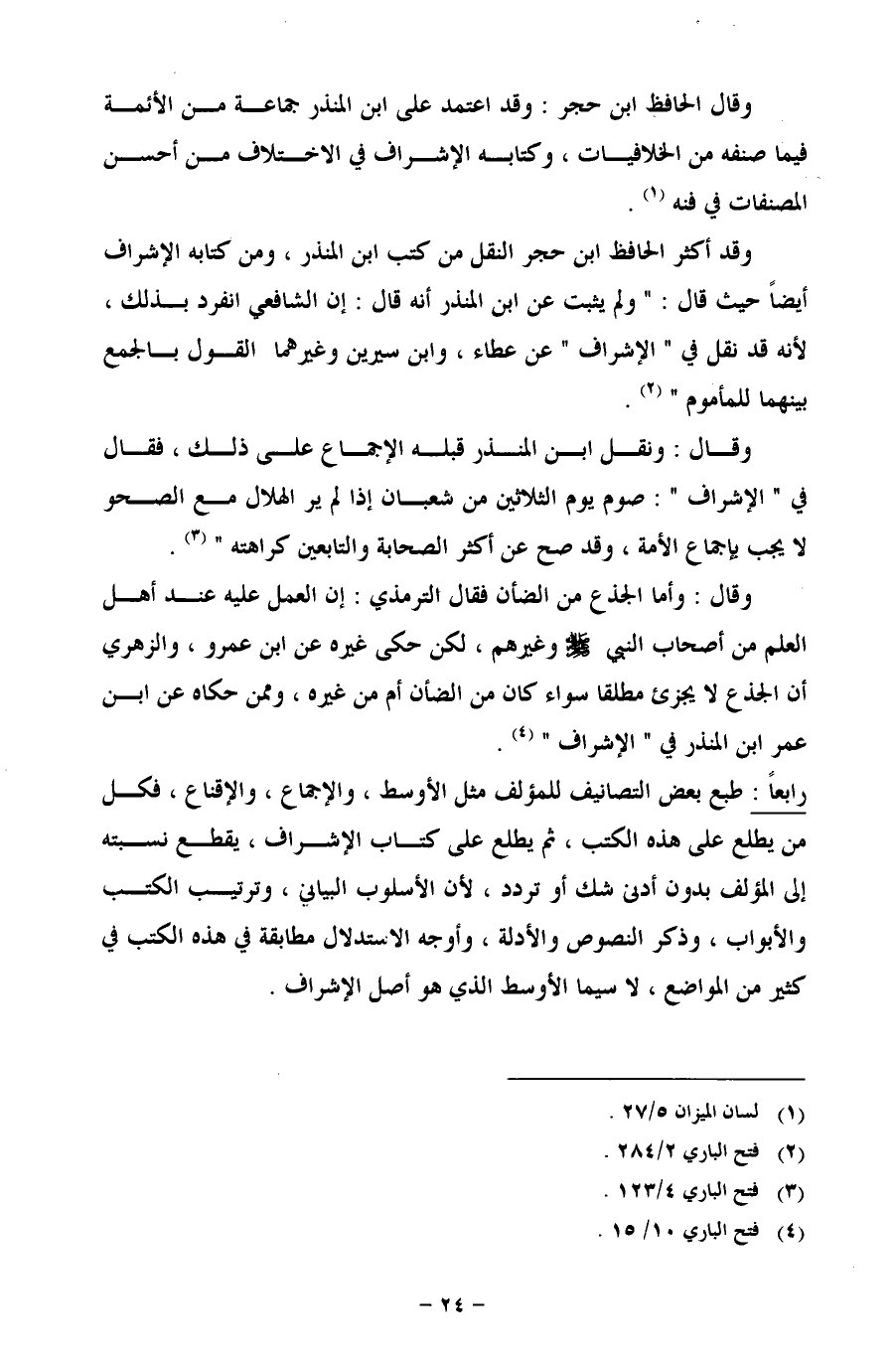 وقال الحافظ ابن حجر: وقد اعتمد على ابن المنذر جماعة من الأئمة فيما صنفه من الخلافيات، وكتابه الإشراف في الاختلاف من أحسن المصنفات في فنه (¬1).
