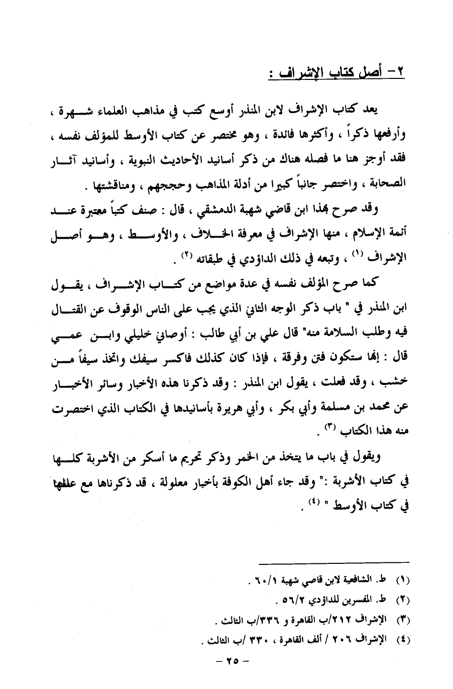كما صرح المؤلف نفسه في عدة مواضع من كتاب الإشراف، يقول ابن المنذر في "باب ذكر الوجه الثاني الذي يجب على الناس الوقوف عن القتال فيه وطلب السلامة منه" قال علي بن أبي طالب: أوصاني خليلي وابن عمي قال: إنها ستكون فتن وفرقة، فإذ كان كذلك فاكسر سيفك واتخذ سيفاً من خشب، وقد فعلت، يقول ابن المنذر: وقد ذكرنا هذه الأخبار وسائر الأخبار عن محمد بن مسلمة وأبي بكر، وأبي هريرة بأسانيدها في الكتاب الذي اختصرت منه هذا الكتاب (¬3).