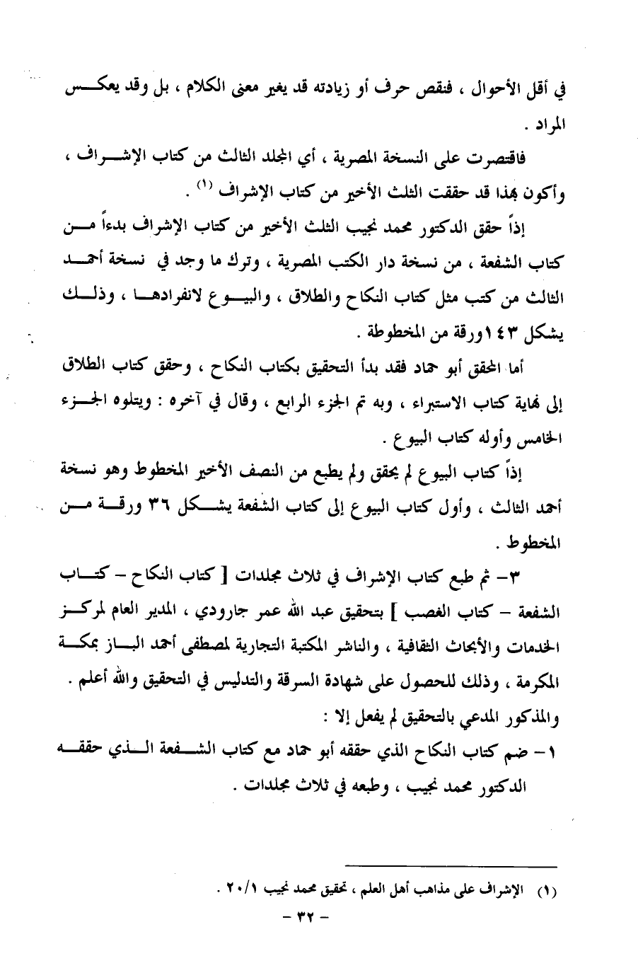 إذاً حقق الدكتور محمد نجيب الثلث الأخير من كتاب الإشراف بدءاً من كتاب الشفعة، من نسخة دار الكتب المصرية، وترك ما وجد في نسخة أحمد الثالث من كتب مثل كتاب النكاح والطلاق، والبيوع لانفرادها، وذلك يشكل 143 ورقة من المخطوطة.