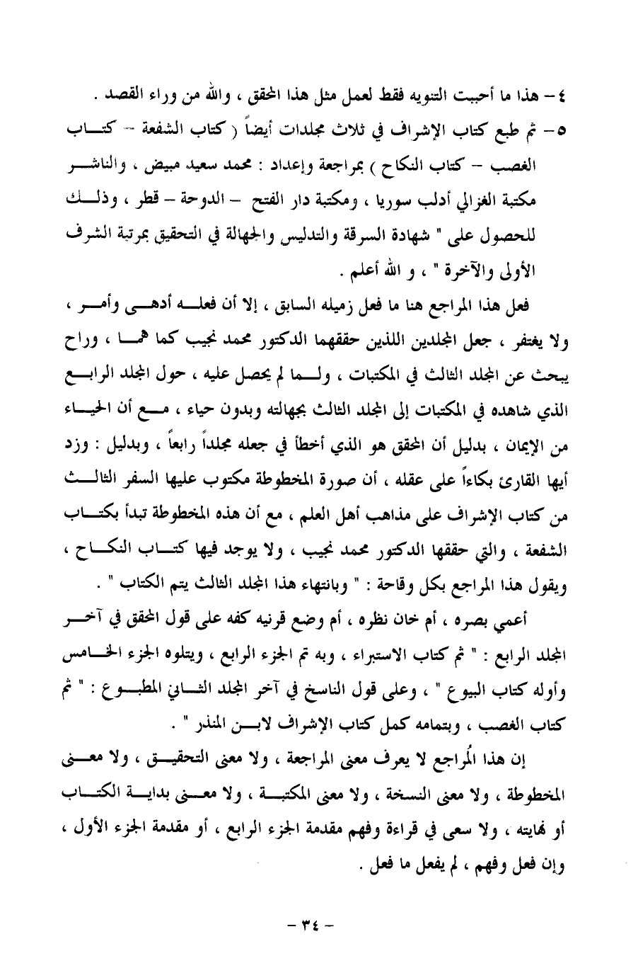 5 - ثم طبع كتاب الإشراف في ثلاث مجلدات يضاً (كتاب الشفعة- كتاب الغصب- كتاب النكاح) بمراجعة وإعداد: محمد سعيد مبيض، والناشر مكتبة الغزالي أدلب سوريا، ومكتبة دار الفتح -الدوحة- قطر، وذلك للحصول على "شهادة السرقة والتدليس والجهالة في التحقيق بمرتبة الشرف الأولى والآخرة"، والله أعلم.
