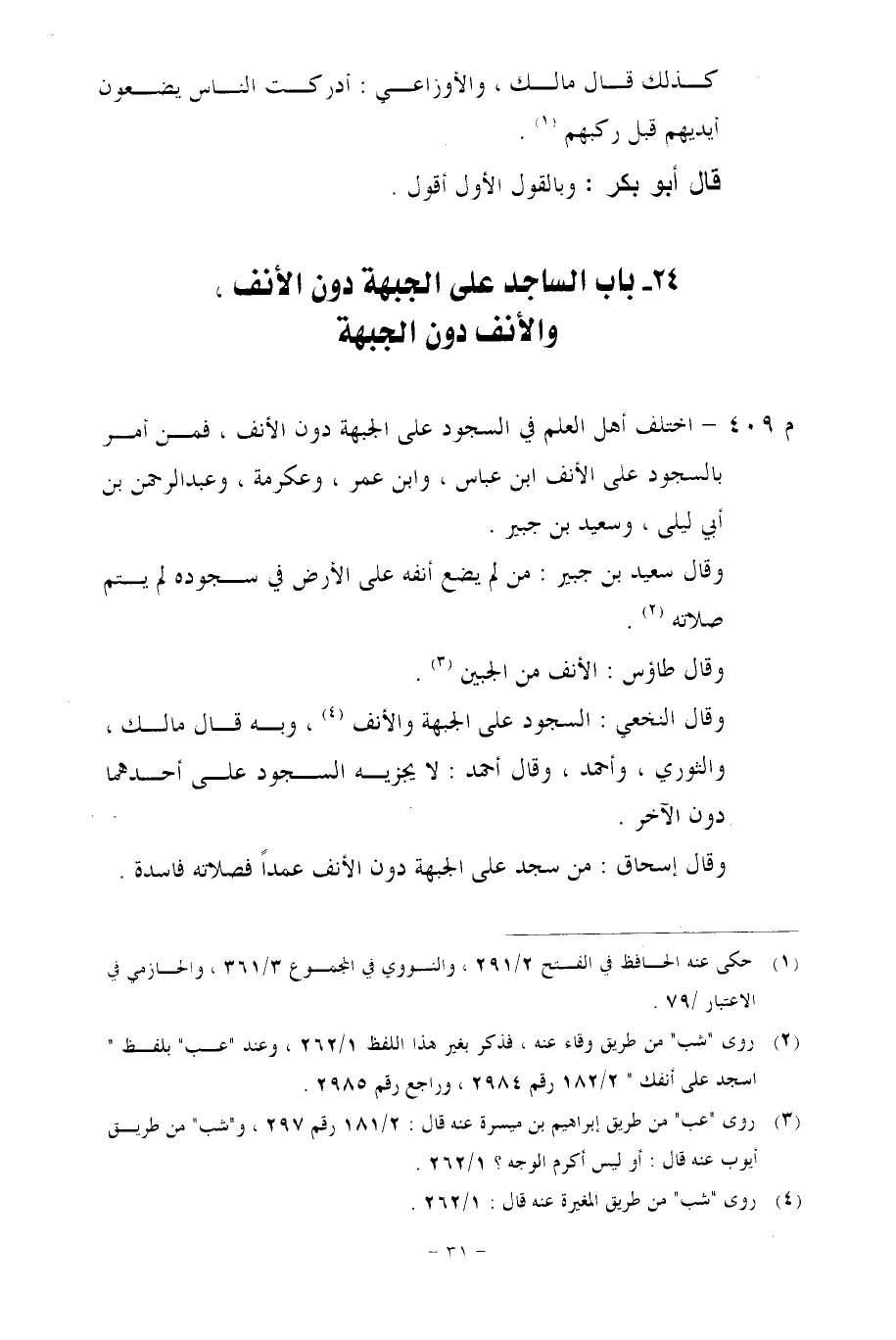 م 409 - اختلف أهل العلم في السجود على الجبهة دون الأنف، فمن أمر بالسجود على الأنف ابن عباس، وابن عمر، وعكرمة، وعبد الرحمن بن أبي ليلى، وسعيد بن جبير.