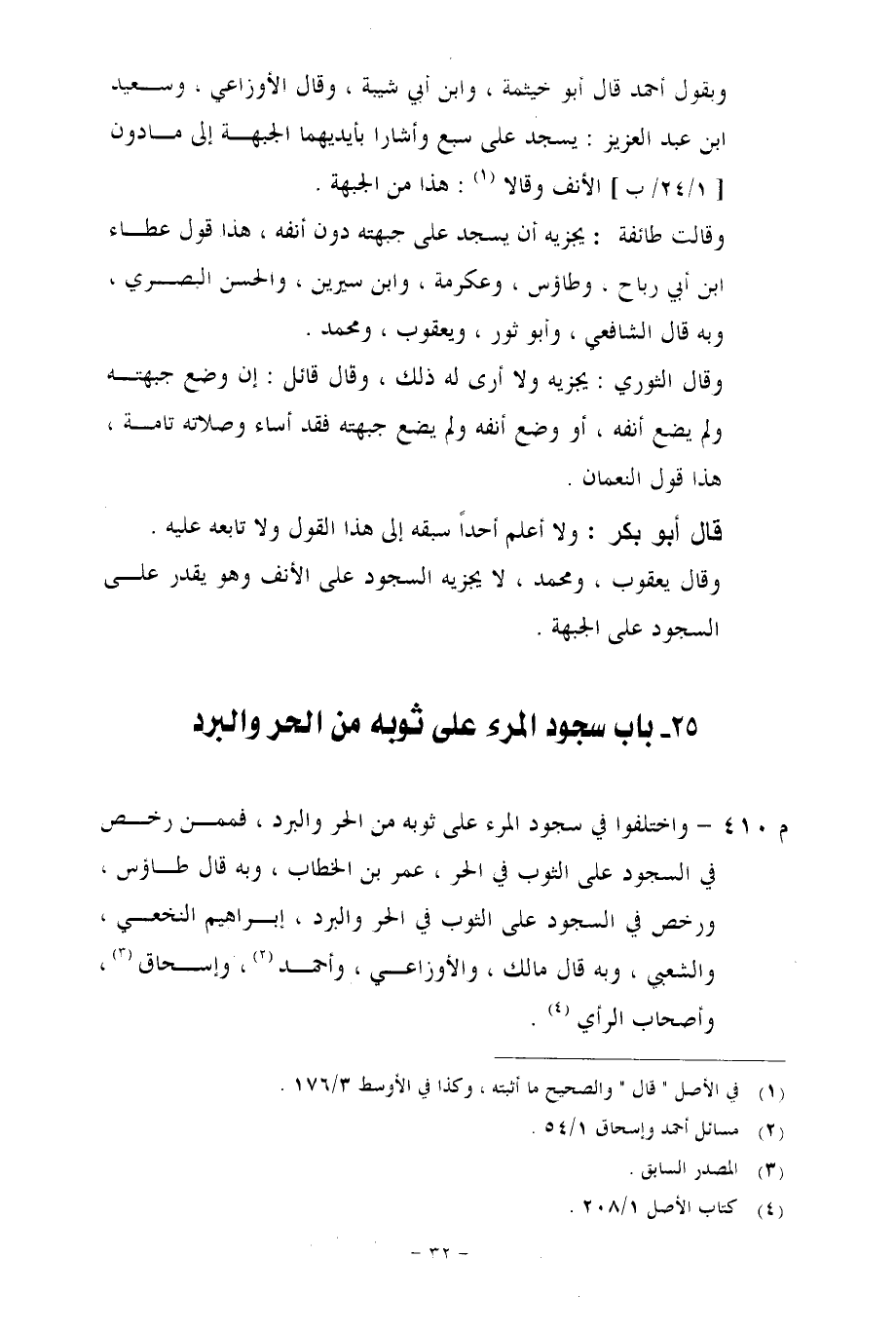 م 410 - واختلفوا في سجود المرء على ثوبه من الحر والبرد، فممن رخص في السجود على الثوب في الحر، عمر بن الخطاب، وبه قال طاؤس، ورخص في السجود على الثوب في الحر والبرد، إبراهيم النخعى، والشعبى، وبه قال مالك، والأوزاعي، وأحمد، وإسحاق، وأصحاب الرأي.
