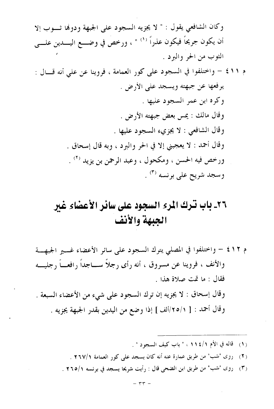 م 411 - واختلفوا في السجود على كور العمامة، فروينا عن علي أنه قال: يرفعها عن جيهته ويسجد على الأرض.
