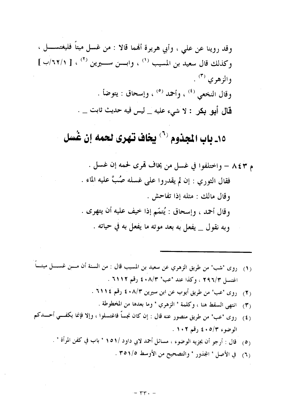 قال مُعِدُّ الكتاب للشاملة: ونص الكلام في الأوسط كما يلي: «وَاخْتَلَفُوا فِي الِاغْتِسَالِ مِنْ غَسْلِ الْمَيِّتِ، فَقَالَتْ طَائِفَةٌ: لَا غُسْلَ عَلَى مَنْ غَسَلَ مَيِّتًا، هَذَا قَوْلُ ابْنِ عَبَّاسٍ، وَابْنِ عُمَرَ، وَعَائِشَةَ، وَالْحَسَنِ الْبَصْرِيِّ، وَالنَّخَعِيِّ، وَبِهِ قَالَ الشَّافِعِيُّ، وَأَحْمَدُ، وَإِسْحَاقُ، وَأَبُو ثَوْرٍ، وَأَصْحَابُ الرَّأْيِ. . . . . . .