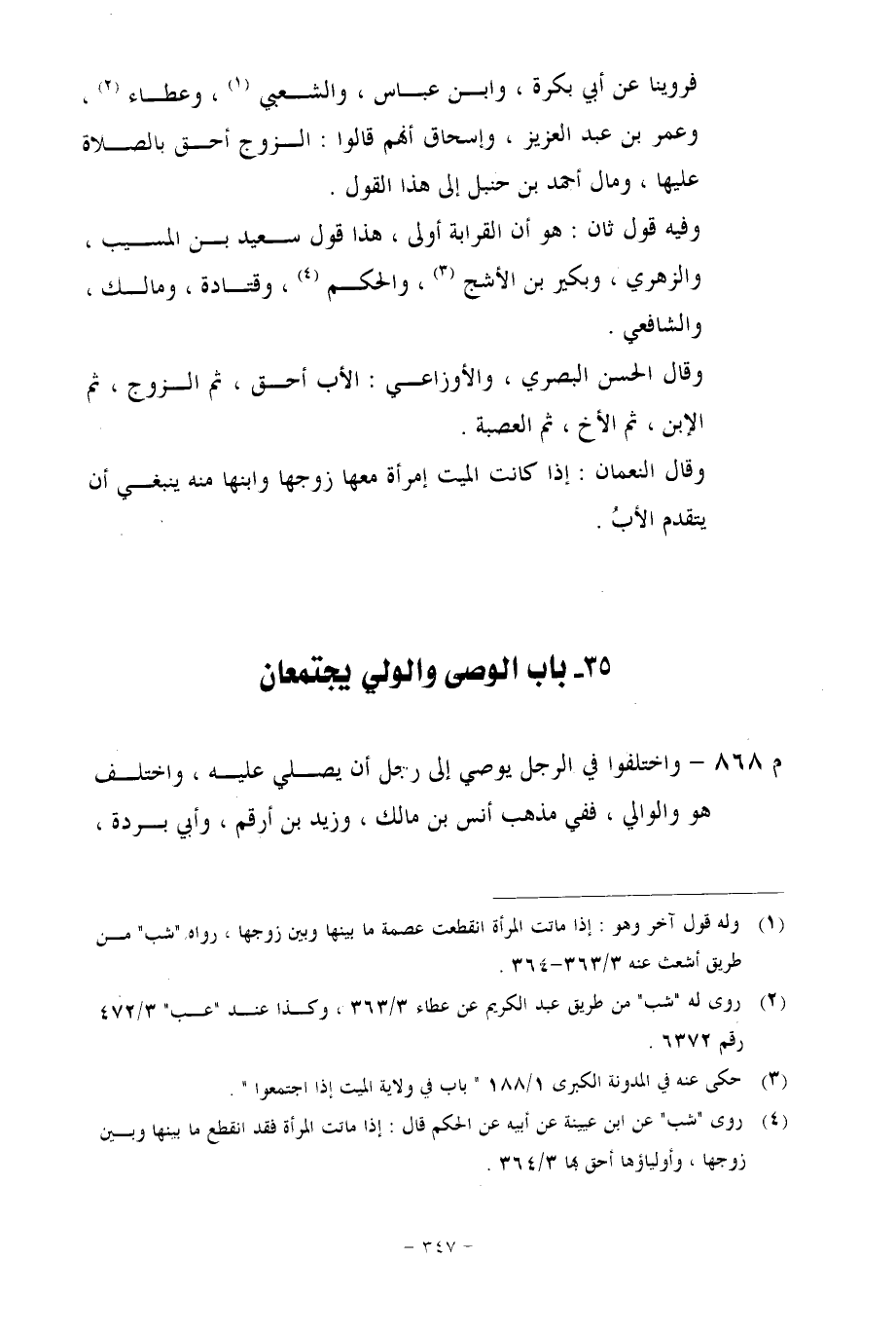 م 868 - واختلفوا في الرجل يوصي إلى رجل أن يصلي عليه، واختلف هو والوالي، ففى مذهب أنس بن مالك، وزيد بن أرقم، وأبي بردة،