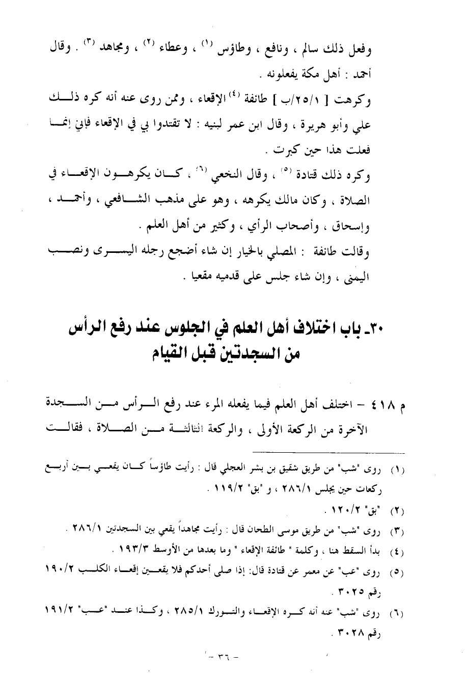 قال مُعِدُّ الكتاب للشاملة: ونص الكلام في الأوسط كما يلي: «وَكَرِهَتْ طَائِفَةٌ الْإِقْعَاءَ، وَمِمَّنْ رُوِيَ عَنْهُ أَنَّهُ كَرِهَ ذَلِكَ عَلِيُّ وَأَبُو هُرَيْرَةَ، وَقَالَ ابْنُ عُمَرَ لِبَنِيهِ: لَا تَقْتَدُوا بِي فِي الْإِقْعَاءِ؛ فَإِنِّي إِنَّمَا فَعَلْتُ هَذَا حِينَ كَبِرْتُ. . . .