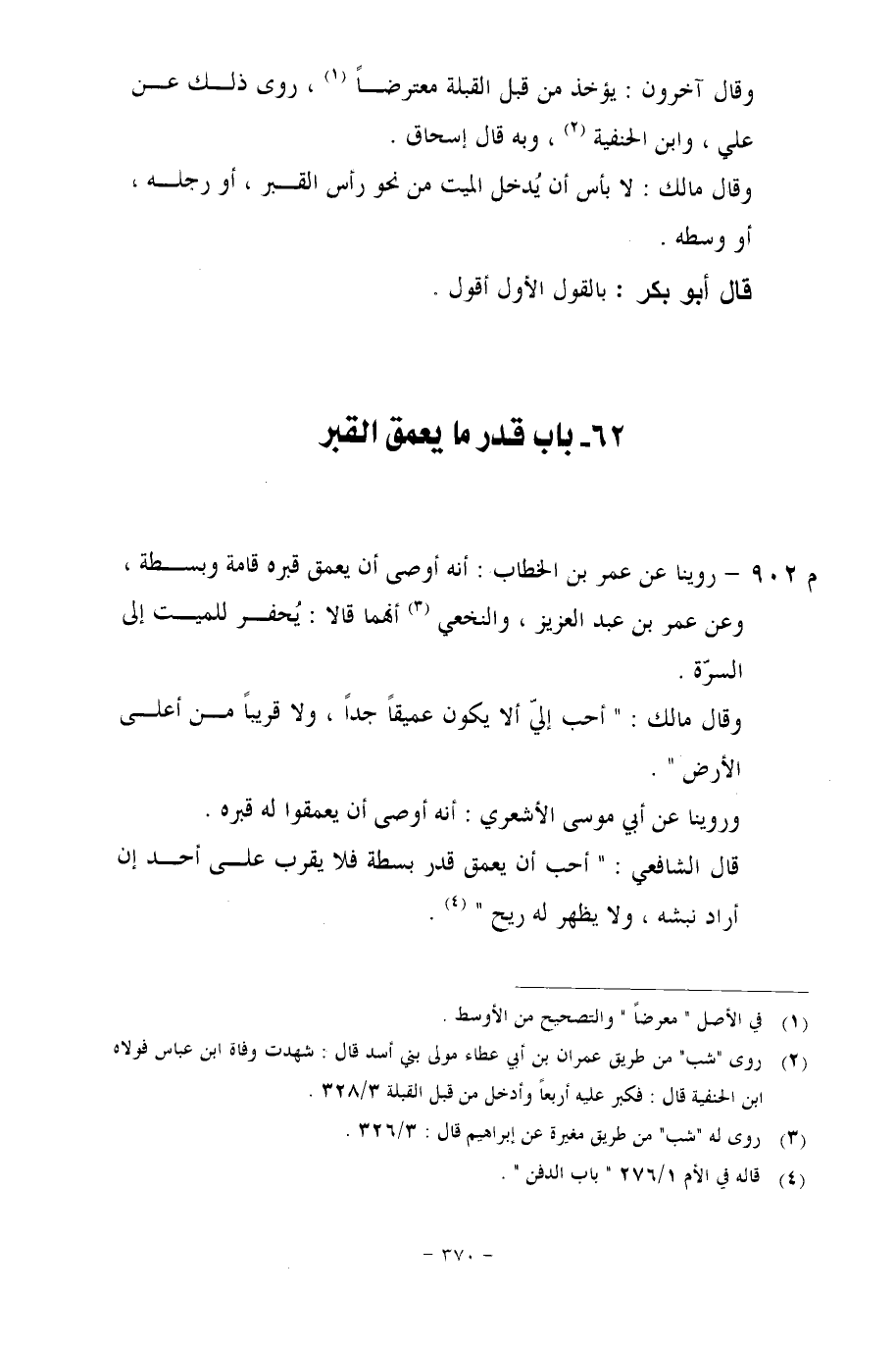 م 902 - روينا عن عمر بن الخطاب: أنه أوصى أن يعمق قبره قامة وبسطة، وعن عمر بن عبد العزيز، والنخعى أنهما قالا: يُحفر للميت إلى السرّة.