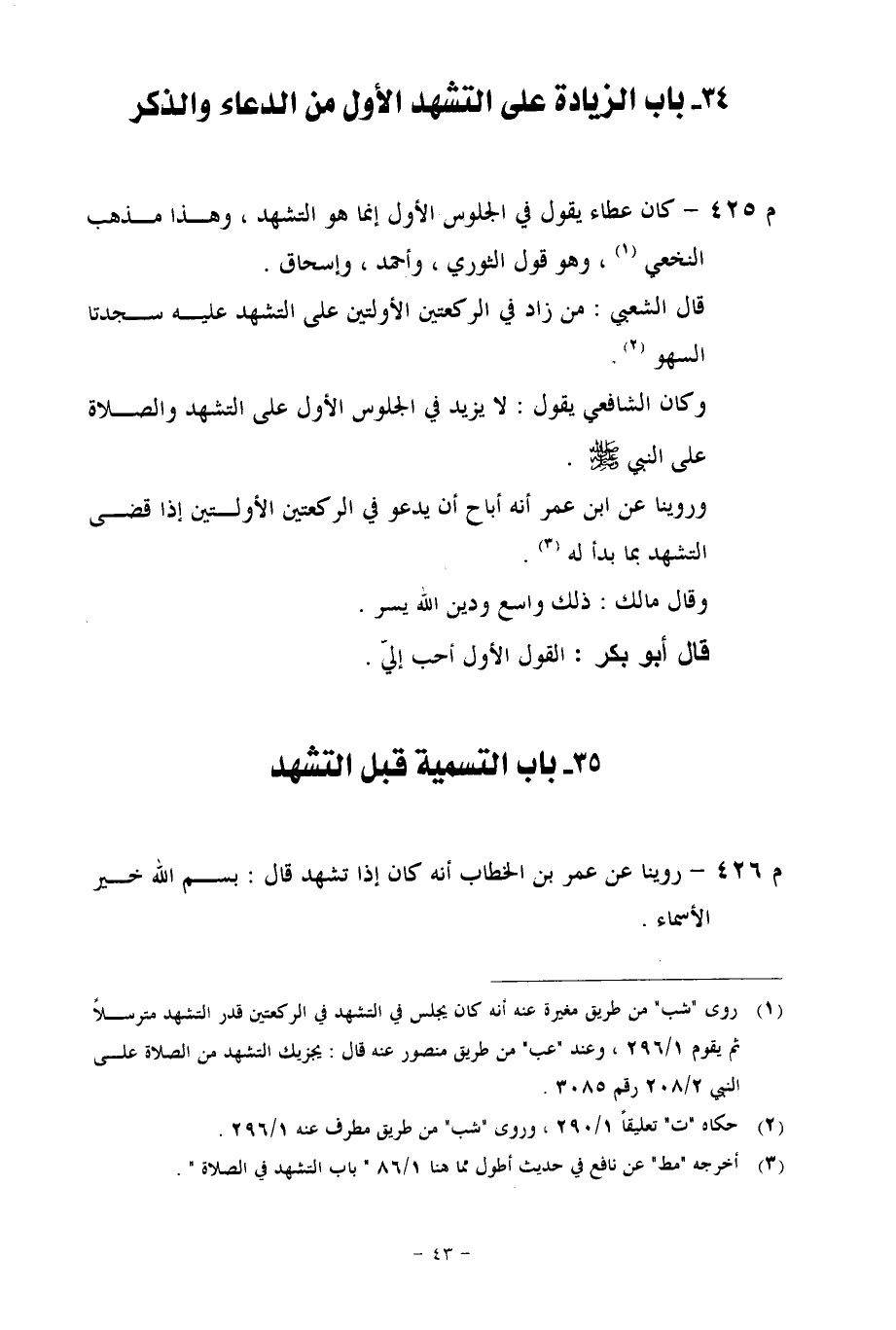م 425 - كان عطاء يقول في الجلوس الأول إنما هو التشهد، وهذا مذهب النخعي، وهو قول الثوري، وأحمد، وإسحاق.