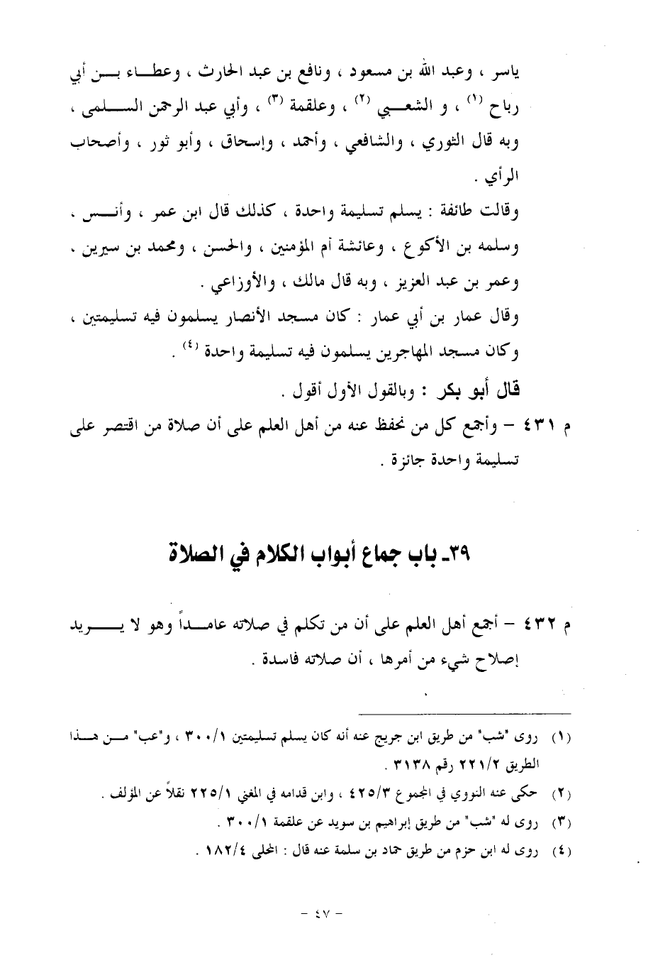 م 432 - أجمع أهل العلم على أن من تكلم في صلاته عامداً وهو لا يريد إصلاح شىء من أمرها، أن صلاته فاسدة.