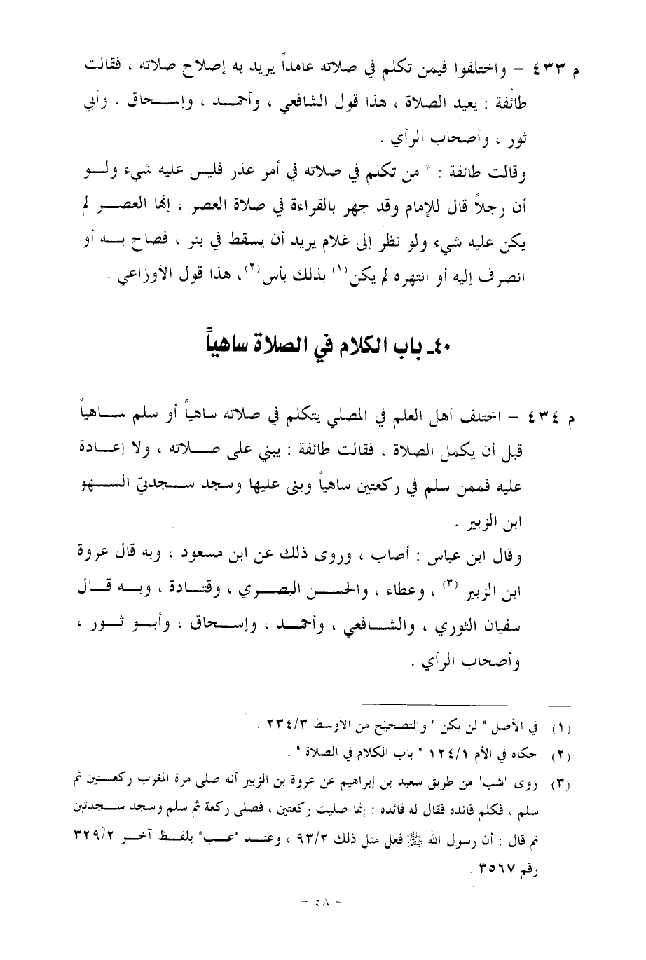 م 433 - واختلفوا فيمن تكلم في صلاته عامداً يريد به إصلاح صلاته، فقالت طائفة: يعيد الصلاة، هذا قول الشافعي، وأحمد، وإسحاق، وأبي ثور، وأصحاب الرأي.