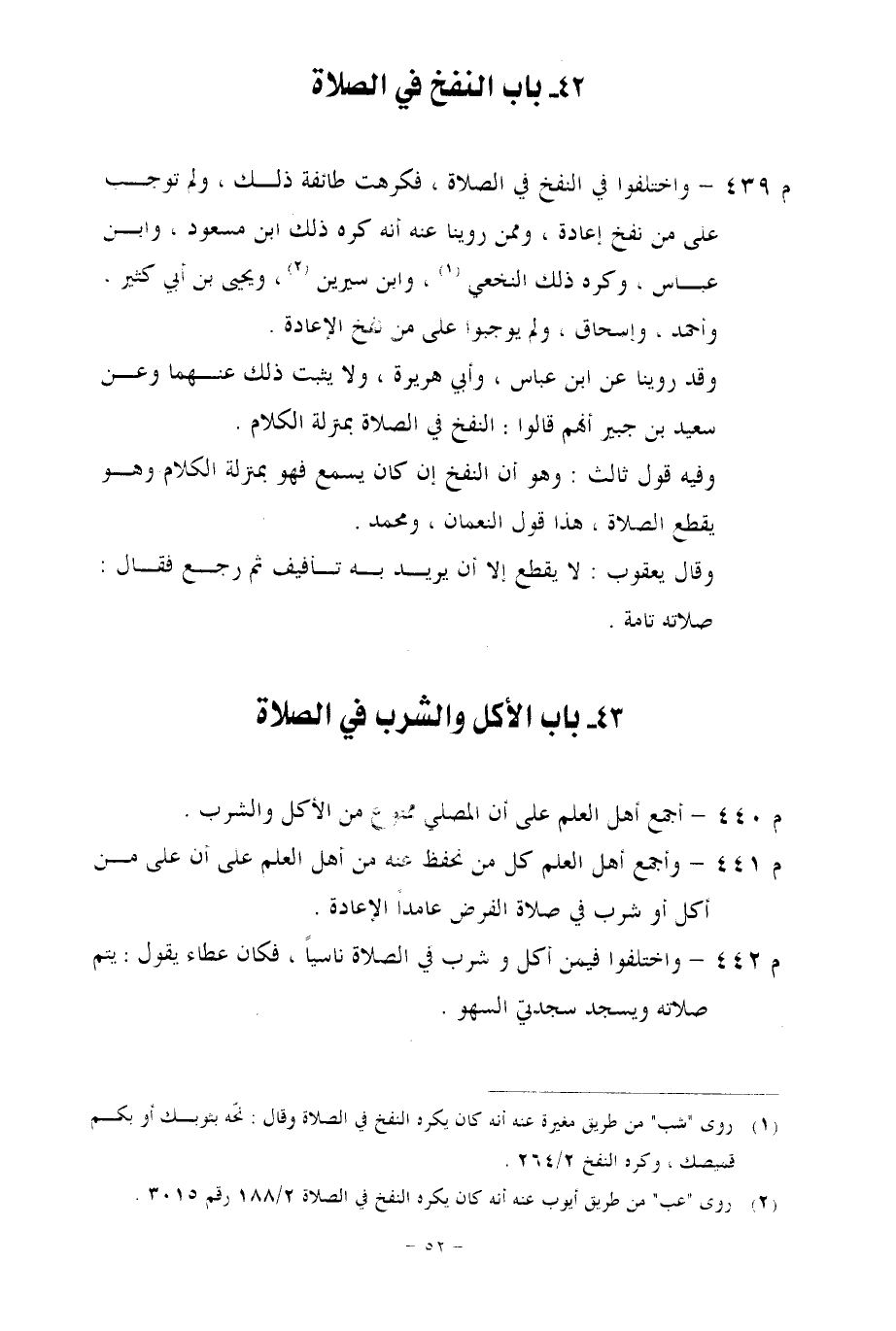 م 439 - واختلفوا في النفخ في الصلاة، فكرهت طائفة ذلك، ولم توجب على من نفخ إعادة، وممن روينا عنه أنه كره ذلك ابن مسعود. وابن عباس، وكره ذلك النخعى، وابن سيرين، ويحيى بن أبي كثير.