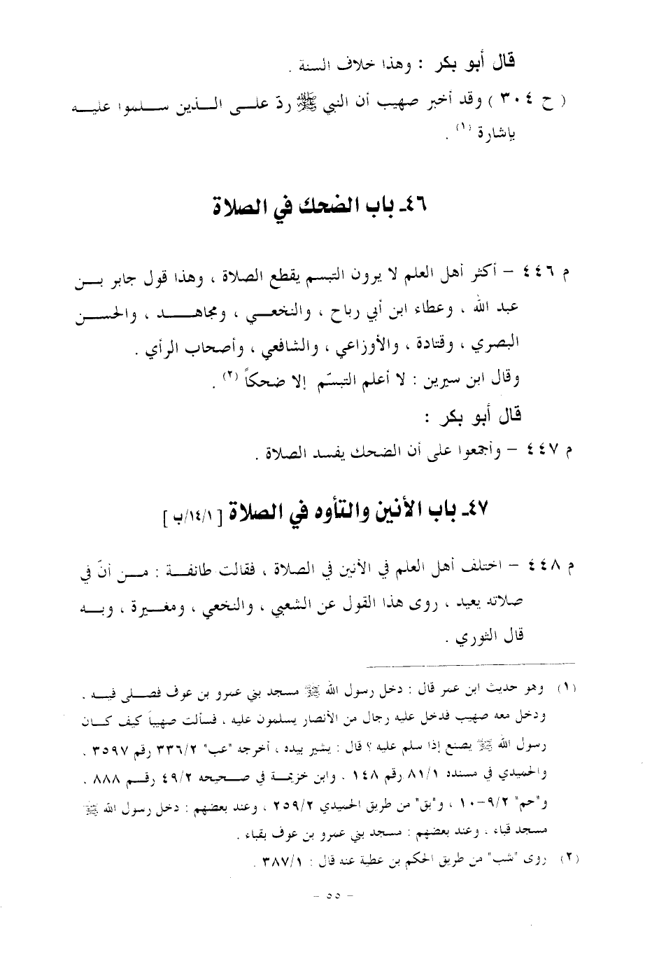 م 446 - أكثر أهل العلم لا يرون التبسم يقطع الصلاة، وهذا قول جابر بن عبد الله، وعطاء ابن أبي رباح، والنخعي، ومجاهد، والحسن البصري، وقتادة، والأوزاعى، والشافعي، وأصحاب الرأي.