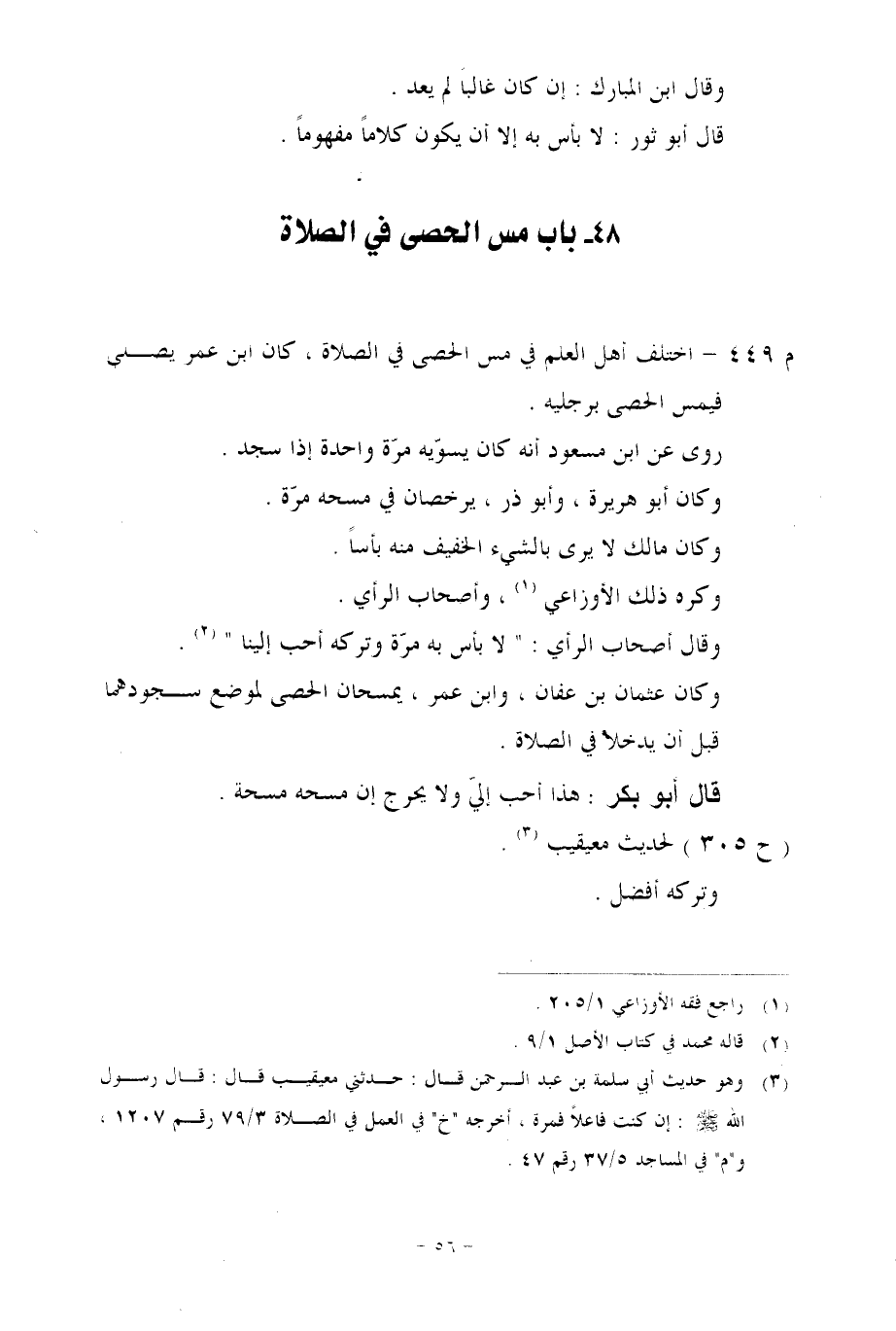 م 449 - اختلف أهل العلم في مس الحصى في الصلاة، كان ابن عمر يصلي فيمس الحصى برجلية.