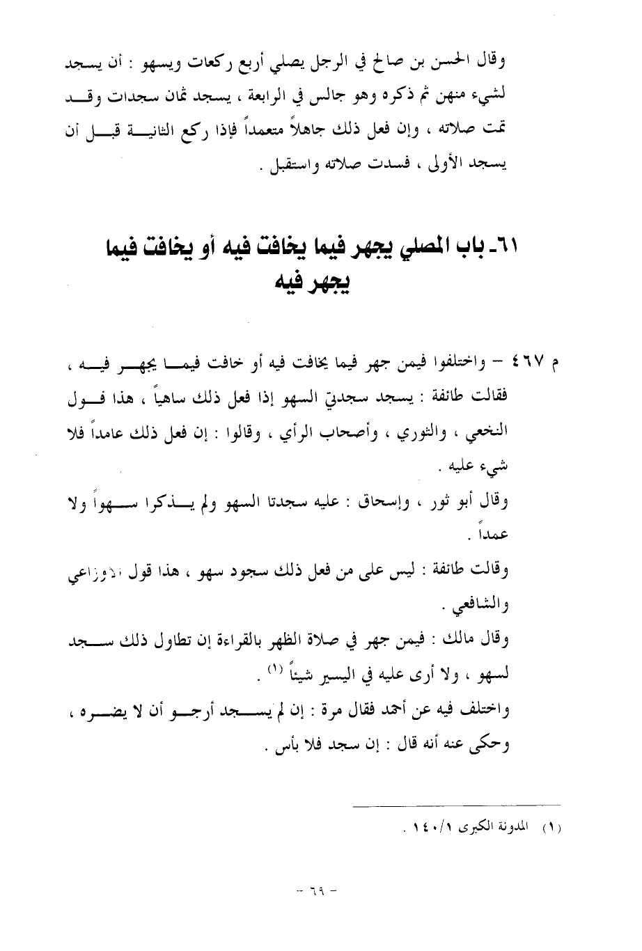 م 467 - واختلفوا فيمن جهر فيما يخافت فيه أو خافت فيما يجهر فيه، فقالت طائفة: يسجد سجدتي السهو إذا فعل ذلك ساهاً، هذا قول النخعى، والثوري، وأصحاب الرأي، وقالوا: إن فعل ذلك عامداً فلا شىء عليه.