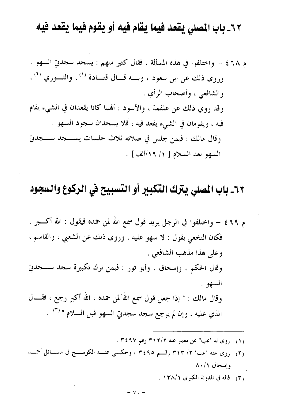 م 468 - واختلفوا في هذه المسألة، فقال كثير منهم: يسجد سجدتي السهو، وروى ذلك عن ابن سعود، وبه قال قتادة، والثوري، والشافعي، وأصحاب الرأي.