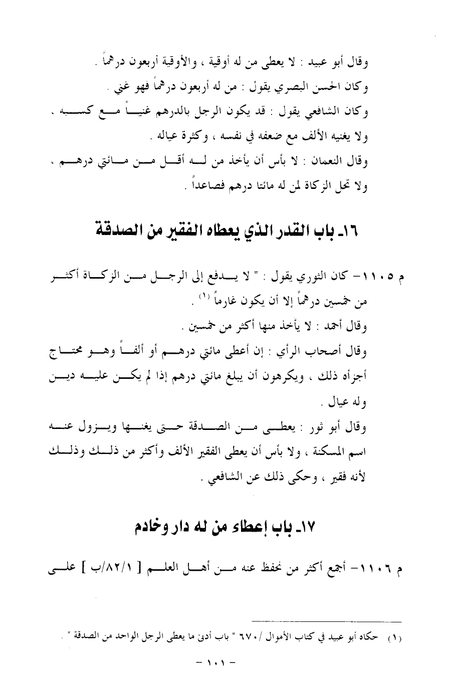 م 1105 - كان الثوري يقول: "لا يدفع إلى الرجل من الزكاة أكثر من خمسين درهماً إلا أن يكون غارماً.