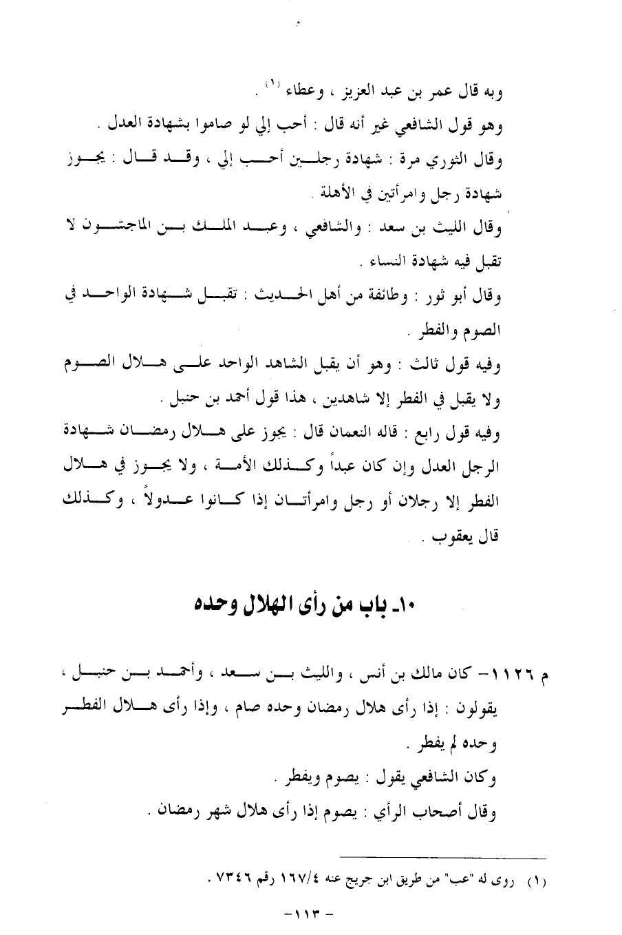 م 1126 - كان مالك بن أنس، والليث بن سعد، وأحمد بن حنبل، يقولون: إذا رأى هلال رمضان وحده صام، وإذا رأى هلال الفطر وحده لم يفطر.