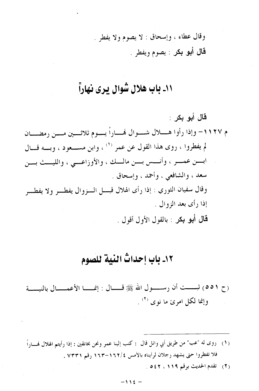 م 1127 - وإذا رأوا هلال شوال نهاراً يوم ثلاثين من رمضان لم يفطروا، روى هذا القول عن عمر، وابن مسعود، وبه قال ابن عمر، وأنس بن مالك، والأوزاعي، والليث بن سعد، والشافعي، وأحمد، وإسحاق.