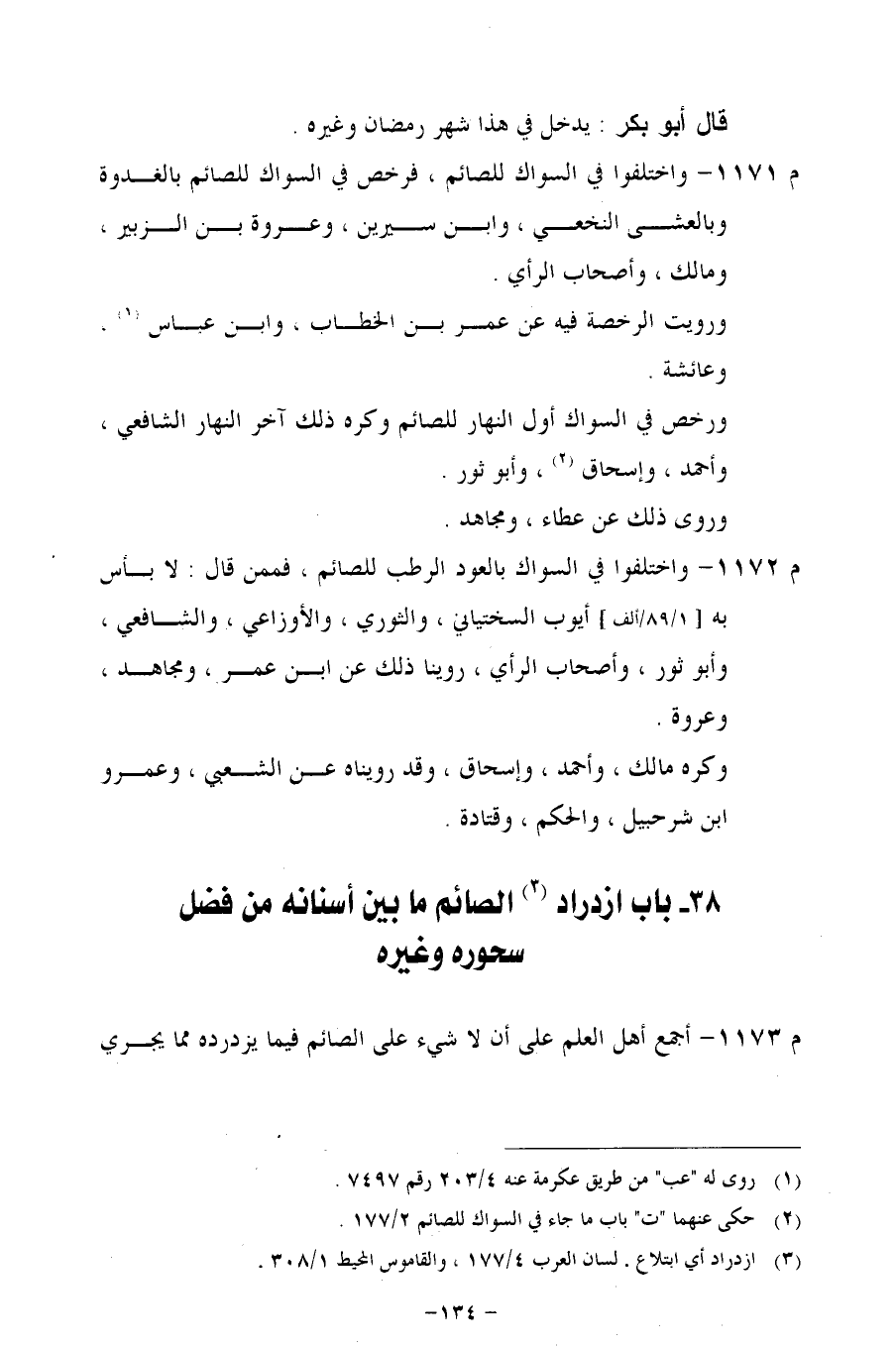 م 1172 - واختلفوا في السواك بالعود الرطب للصائم، فممن قال: لا بأس به [1/ 89/ألف] أيوب السختياني، والثوري، والأوزاعي، والشافعي، وأبو ثور، وأصحاب الرأي، روينا ذلك عن ابن عمر، ومجاهد، وعروة.