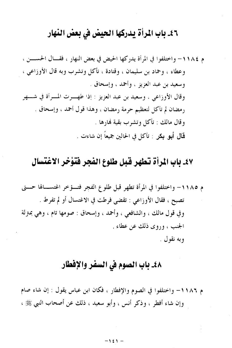 م 1185 - واختلفوا في المرأة تطهر قبل طلوع الفجر فتؤخر اغتسالها حتى تصبح، فقال الأوزاعي: تقضى فرطت في الاغتسال أو لم تفرط.
