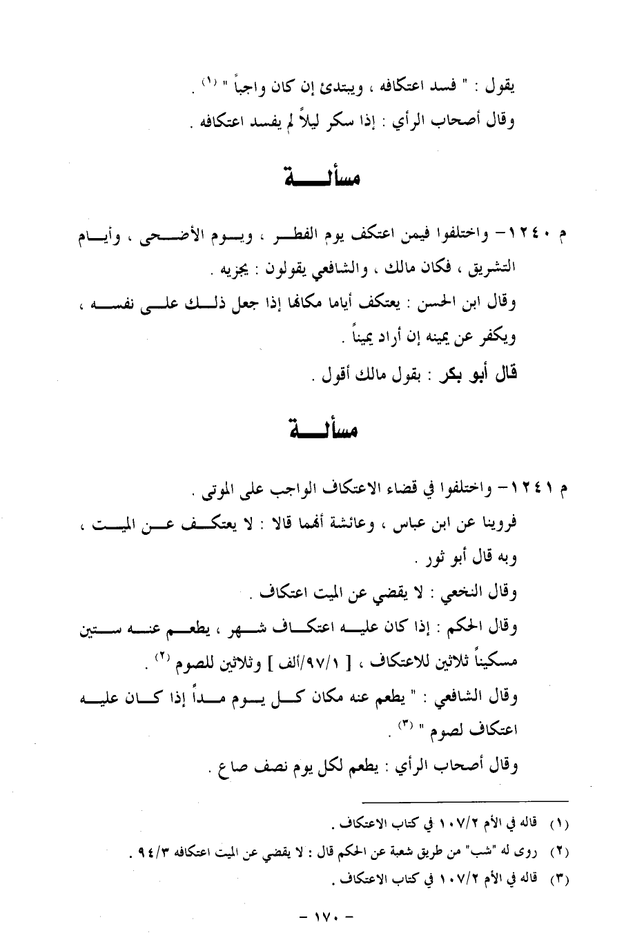 م 1240 - واختلفوا فيمن اعتكف يوم الفطر، ويوم الأضحى، وأيام التشريق، فكان مالك، والشافعي يقولون: يجزيه.