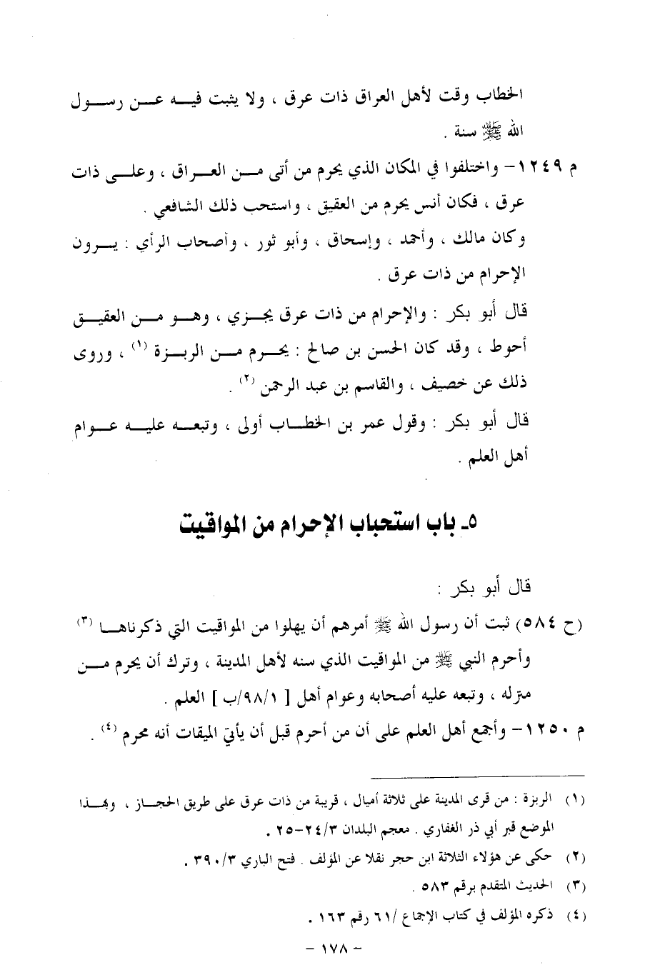 (ح 584) ثبت أن رسول الله- صلى الله عليه وسلم -أمرهم أن يهلوا من المواقت إلى ذكرناها وأحرم النبي -صلى الله عليه وسلم- من المواقيت الذي سنه لأهل المدينة، وترك أن يحرم من منزله، وتبعه عليه أصحابه وعوام أهل [1/ 98/ب] العلم.