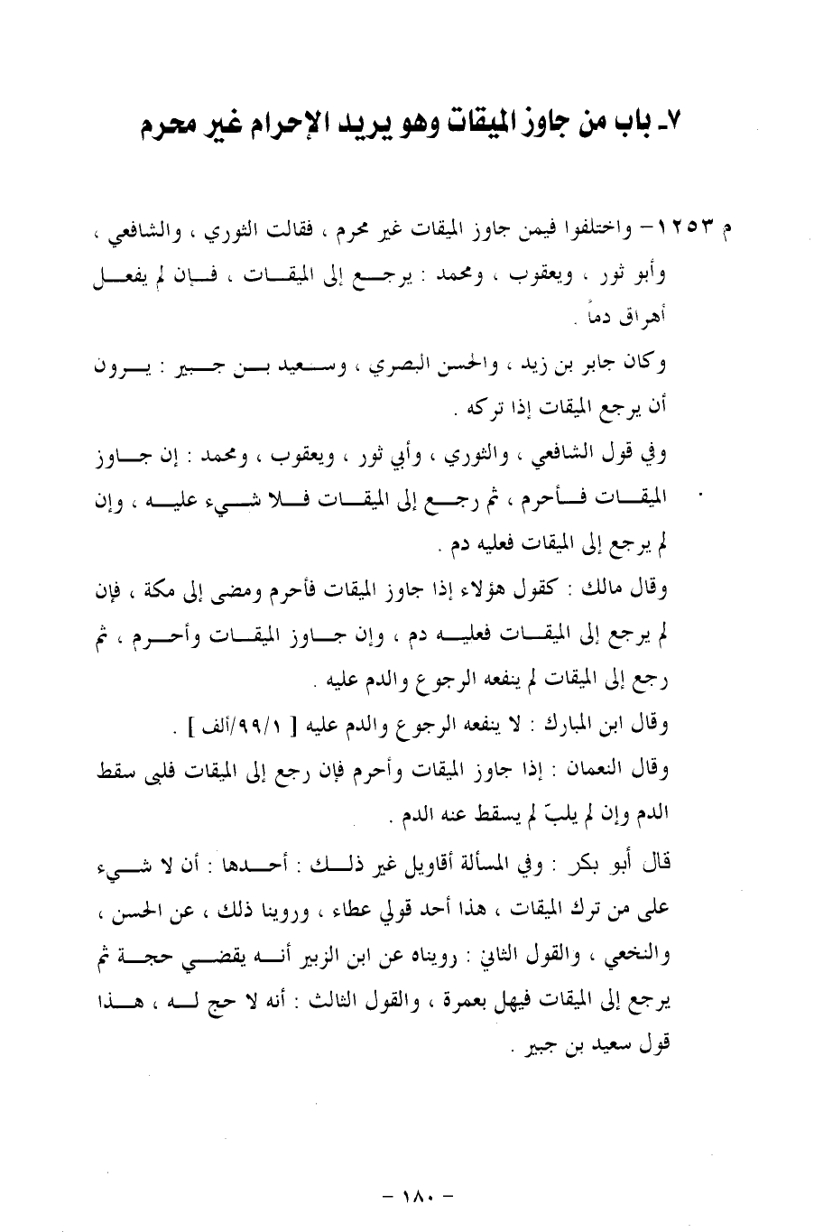 م 1253 - واختلفوا فيمن جاوز الميقات غير محرم، فقالت الثوري، والشافعي، وأبو ثور، ويعقوب، ومحمد: يرجع إلى الميقات، فإن لم يفعل أهراق دماً.