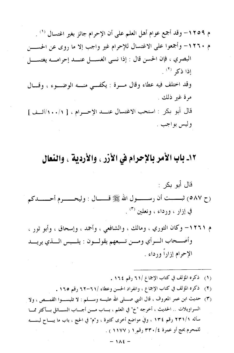 م 1261 - وكان الثوري، ومالك، والشافعي، وأحمد، وإسحاق، وأبو ثور، وأصحاب الرأي ومن تبعهم يقولون: يلبس الذي يريد الإحرام إزاراً ورداء.