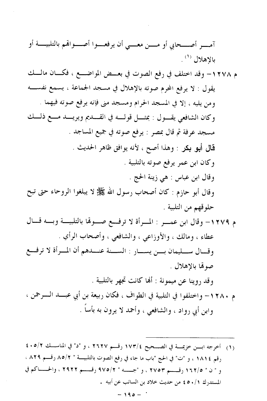 م 1278 - وقد اختلف في رفع الصوت في بعض المواضع، فكان مالك يقول: لا يرفع المحرم صوته بالإهلال في مسجد الجماعة، يسمع نفسه ومن يليه، إلا في المسجد الحرام ومسجد منى فإنه يرفع صوته فيهما.