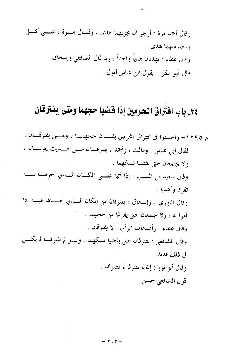 م 1295 - واختلفوا في افتراق المحرمين يفسدان حجهما، ومتى يفترقان، فقال ابن عباس، ومالك، وأحمد، يفترقان من حديث يحرمان، ولا يجتمعان حتى يقضيا نسكهما.
