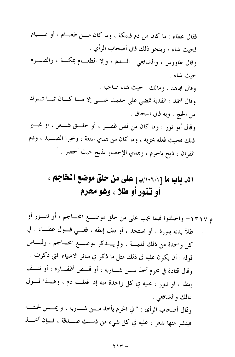 م 1317 - واختلفوا فيما يجب على من حلق موضع المحاجم، أو تنور أو طلأ بدنه بنورة، أو استحد، أو نتف إبطه، ففي قول عطاء: في كل واحدة من ذلك فدية، ولم يذكر موضع المحاجم، وقياس قوله: أن يكون عليه في ذلك مثل ما ذكر في سائر الأشياء التي ذكرت.