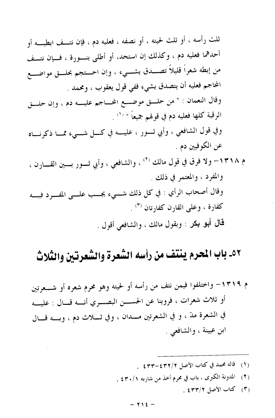 م 1319 - واختلفوا فيمن نتف رأسه أو لحيته وهو محرم شعره أو شعرتين أو ثلاث شعرات، فروينا عن الحسن البصري أنه قال: عليه في الشعرة مدّ، وفي الشعرتين مدان، وفي ثلاث دم، وبه قال ابن عيية، والشافعي.
