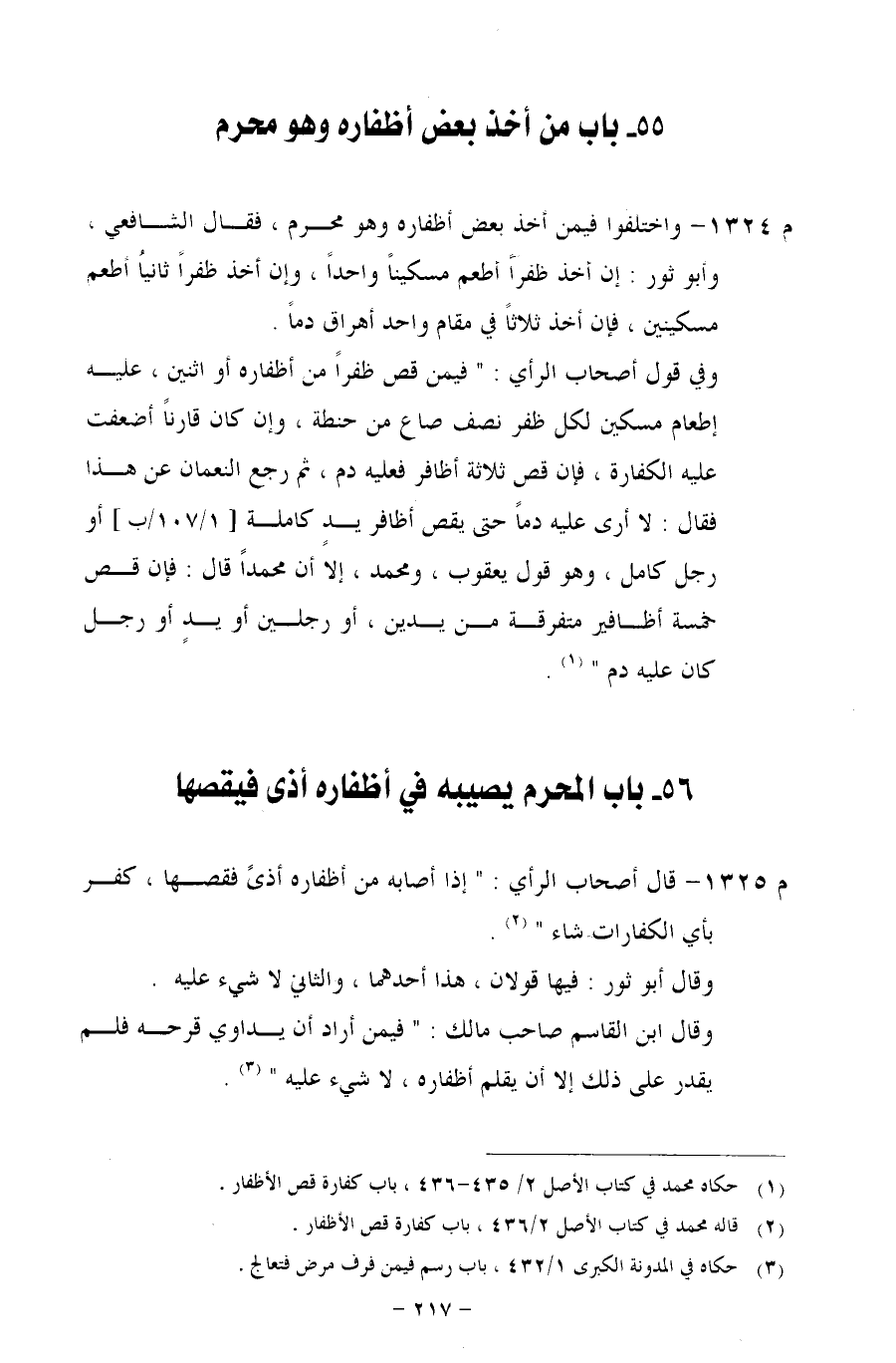 م 1325 - قال أصحاب الرأي: "إذا أصابه من أظفاره أذىً فقصها، كفر بأي الكفارات شاء".