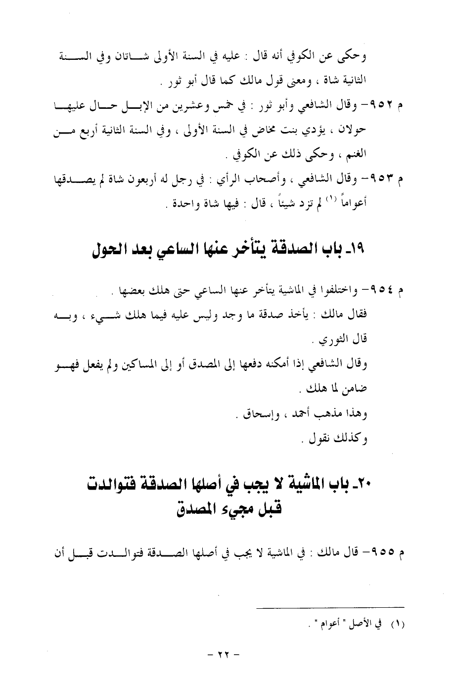 م 952 - وقال الشافعي وأبو ثور: في خمس وعشرين من الإبل حال عليها حولان، يؤدي بنت مخاض في السنة الأولى، وفي السنة الثانية أربع من الغنم، وحكى ذلك عن الكوفي.