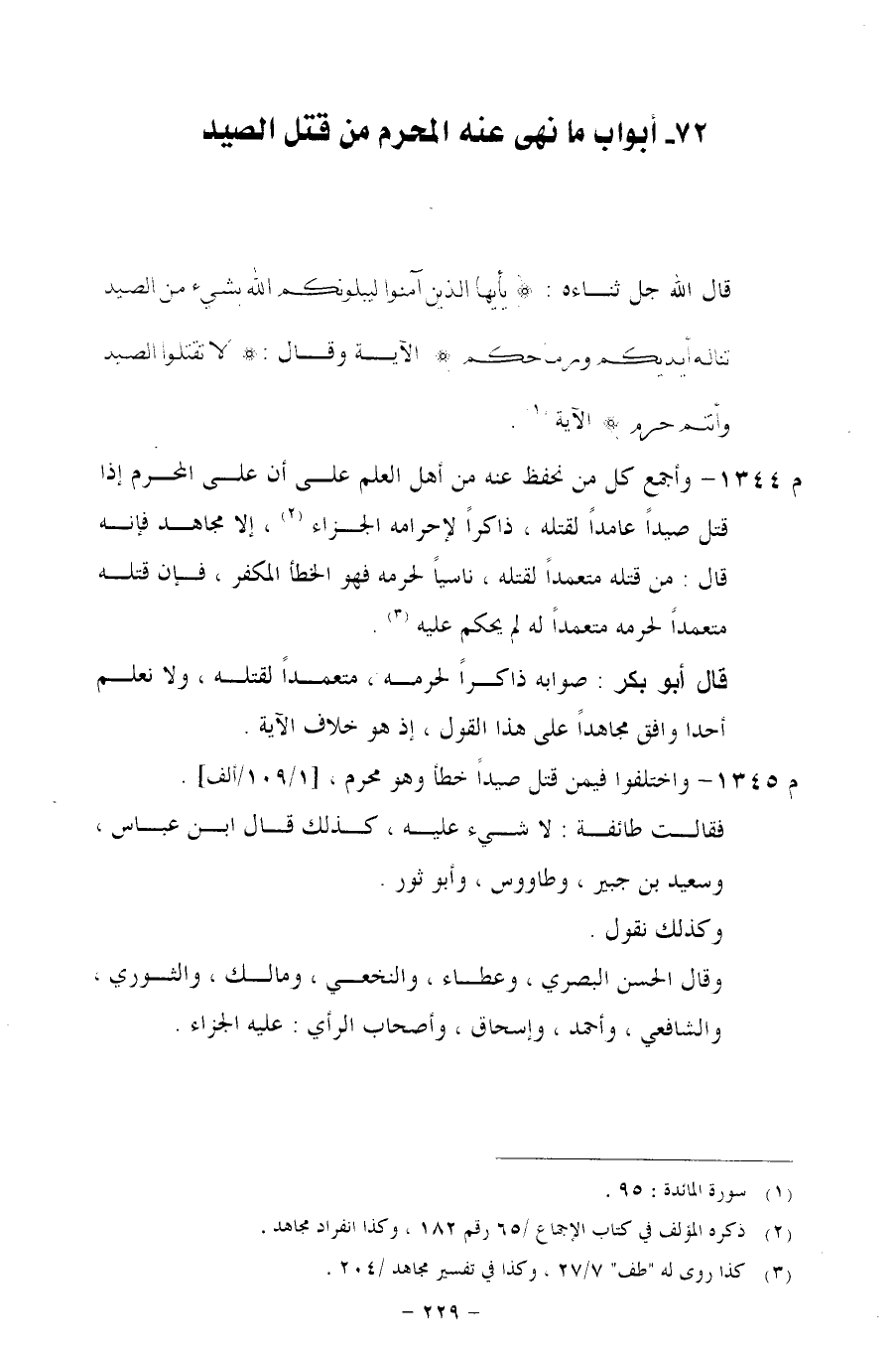 م 1345 - واختلفوا فيمن قتل صيداً خطأ وهو محرم، [1/ 109/ألف].