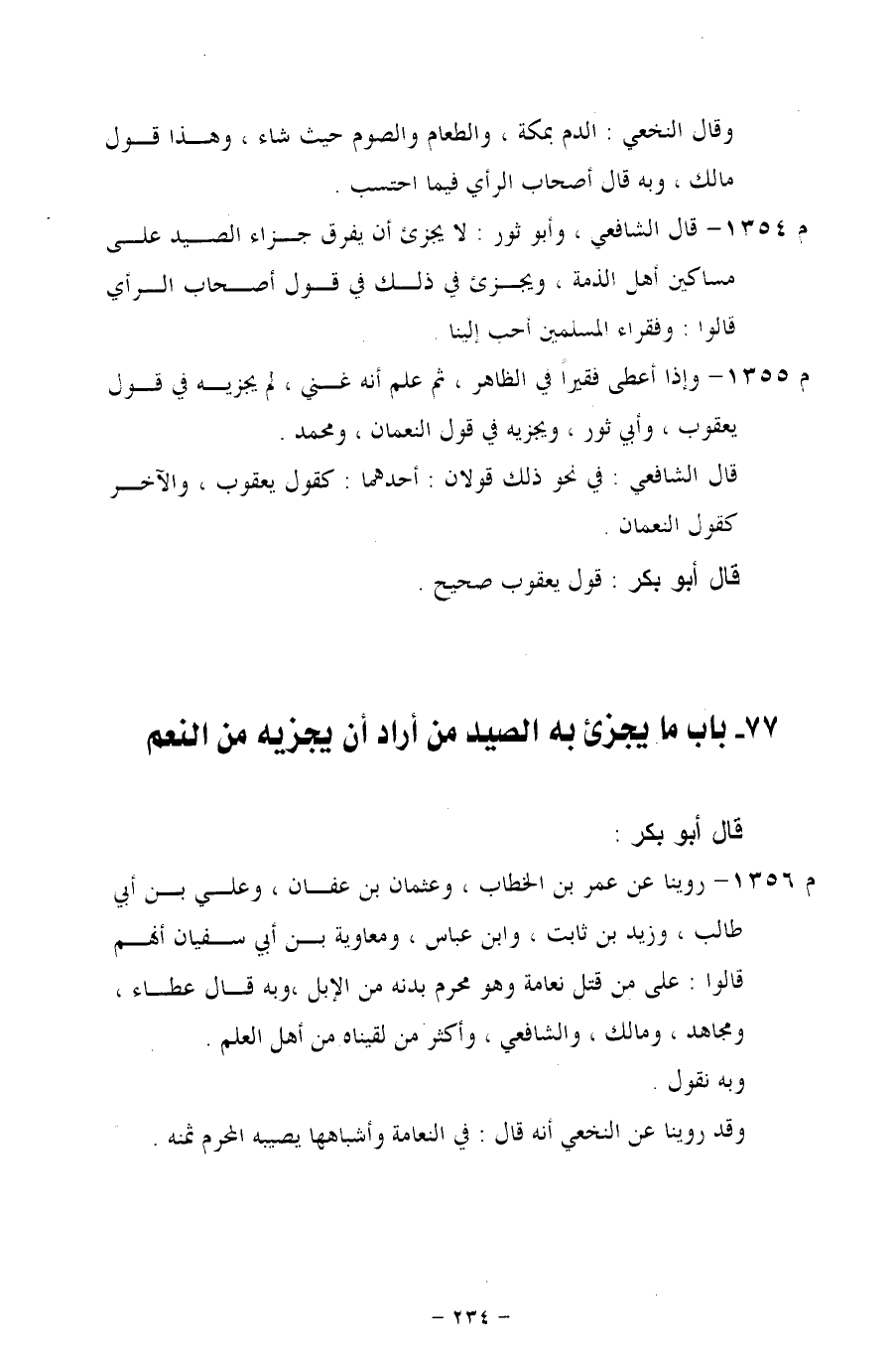 م 1356 - روينا عن عمر بن الخطاب، وعثمان بن عفان، وعلي بن أبي طالب، وزيد بن ثابت، وابن عباس، ومعاوية بن أبي سفيان أنهم قالوا: على من قتل نعامة وهو محرم بدنه من الإبل، وبه قال عطاء، ومجاهد، ومالك، والشافعي، وأكثر من لقيناه من أهل العلم.