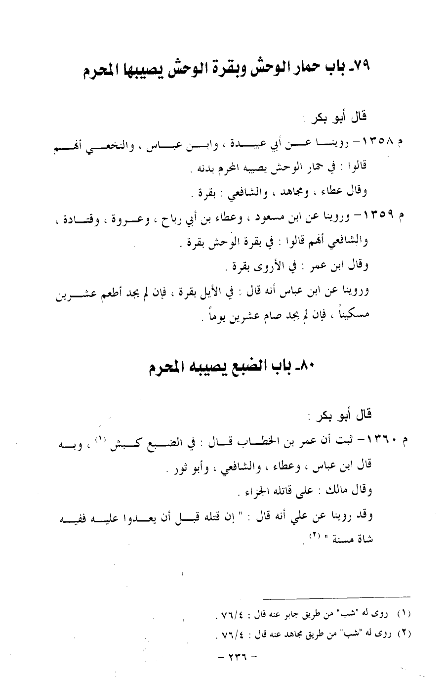 م 1360 - ثبت أن عمر بن الخطاب قال: في الضبع كبش، وبه قال ابن عباس، وعطاء، والشافعي، وأبو ثور.