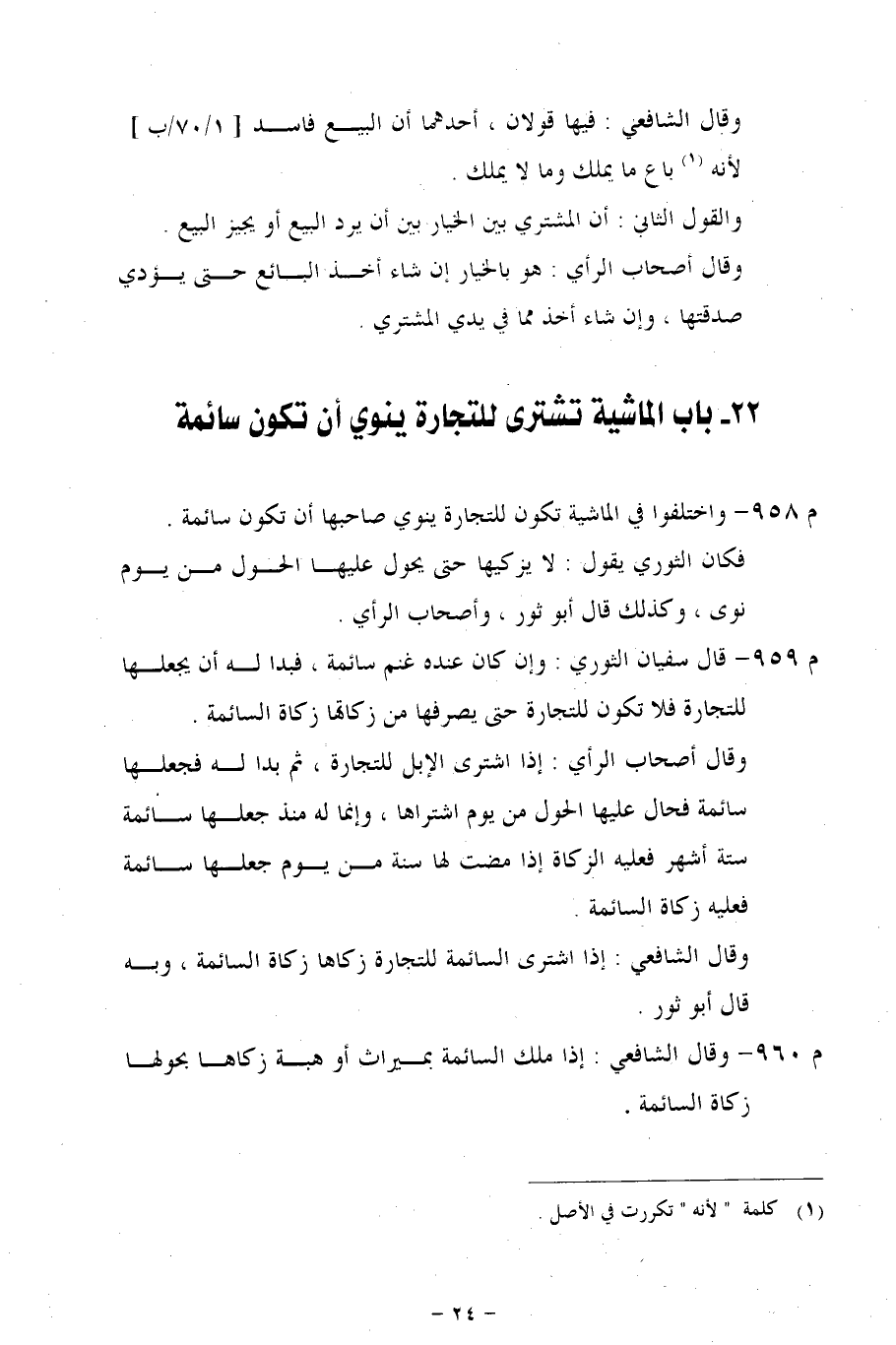 م 958 - واختلفوا الماشية تكون للتجارة ينوي صاحبها أن تكون سائمة.