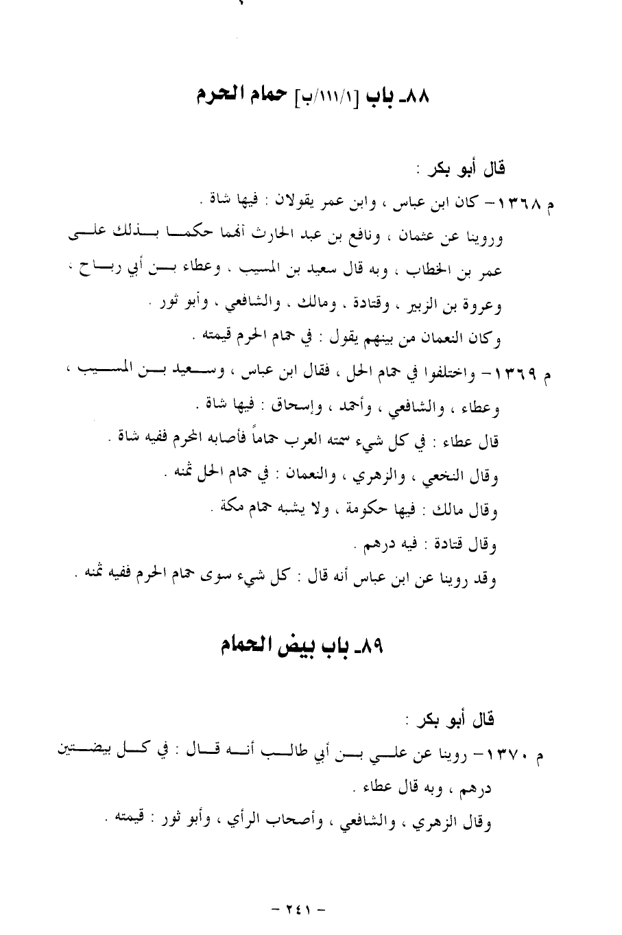 م 1369 - واختلفوا في حمام الحل، فقال ابن عباس، وسعيد بن المسيب، وعطاء، والشافعي، وأحمد، وإسحاق: فيها شاة.