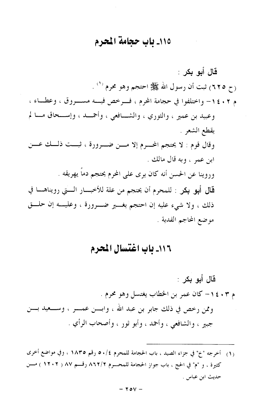 م 1402 - واختلفوا في حجامة المحرم، فرخص فيه مسوق، وعطاء، وعبيد بن عمير، والثوري، والشافعي وأحمد، وإسحاق ما لم يقطع الشعر.