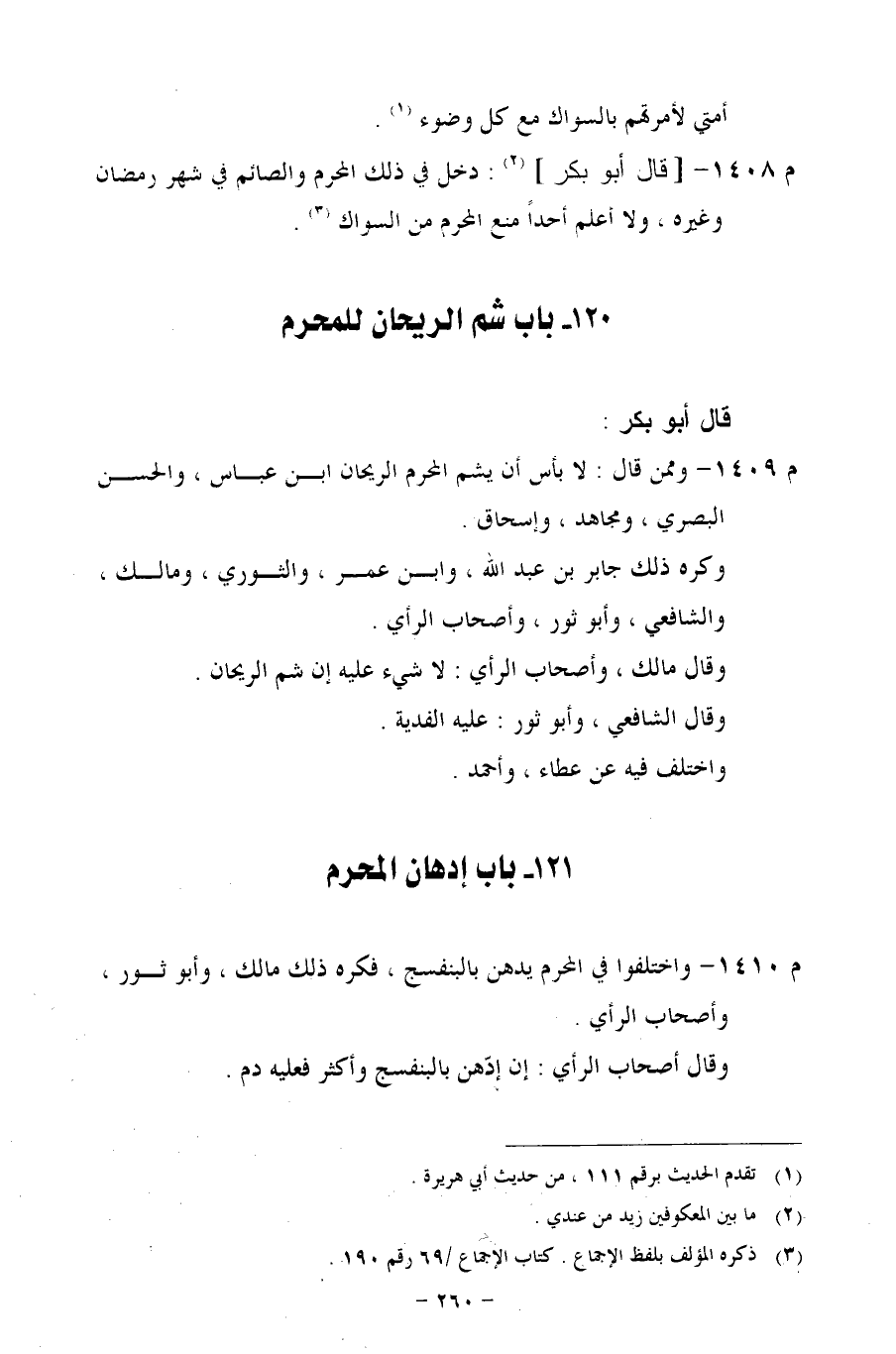 م 1409 - وممن قال: لا بأس أن يشم المحرم الريحان ابن عباس، والحسن البصري، ومجاهد، وإسحاق.