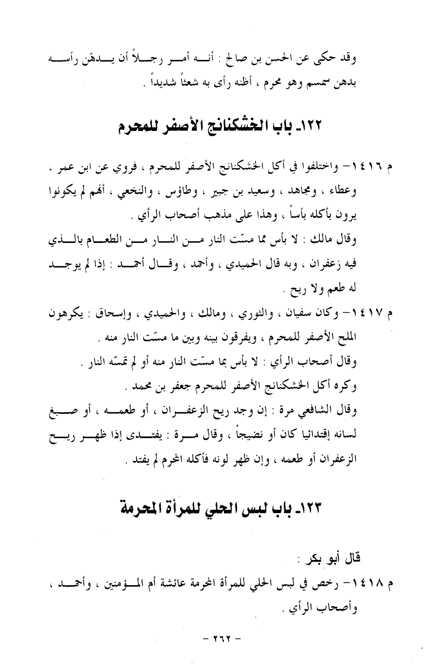 م 1416 - واختلفوا في أكل الخشكنانج الأصفر للمحرم، فروي عن ابن عمر، وعطاء ومجاهد، وسعيد بن جبير، وطاؤس، والنخعي، أنهم لم يكونوا يرون بأكله بأساً، وهذا على مذهب أصحاب الرأي.