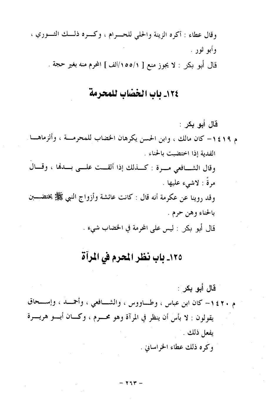 م 1420 - كان ابن عباس، وطاووس، والشافعي، وأحمد، وإسحاق يقولون: لا بأس أن ينظر في المرآة وهو محرم، وكان أبو هريرة يفعل ذلك.